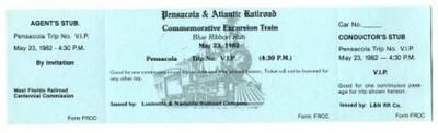 A complete ticket for the Pensacola Atlantic Railroad Commemorative Excursion Train from Pensacola, Florida on May 23, 1982. Issued by the Louisville and Nashville Railroad. In mint condition. The Blue Ribbon Run