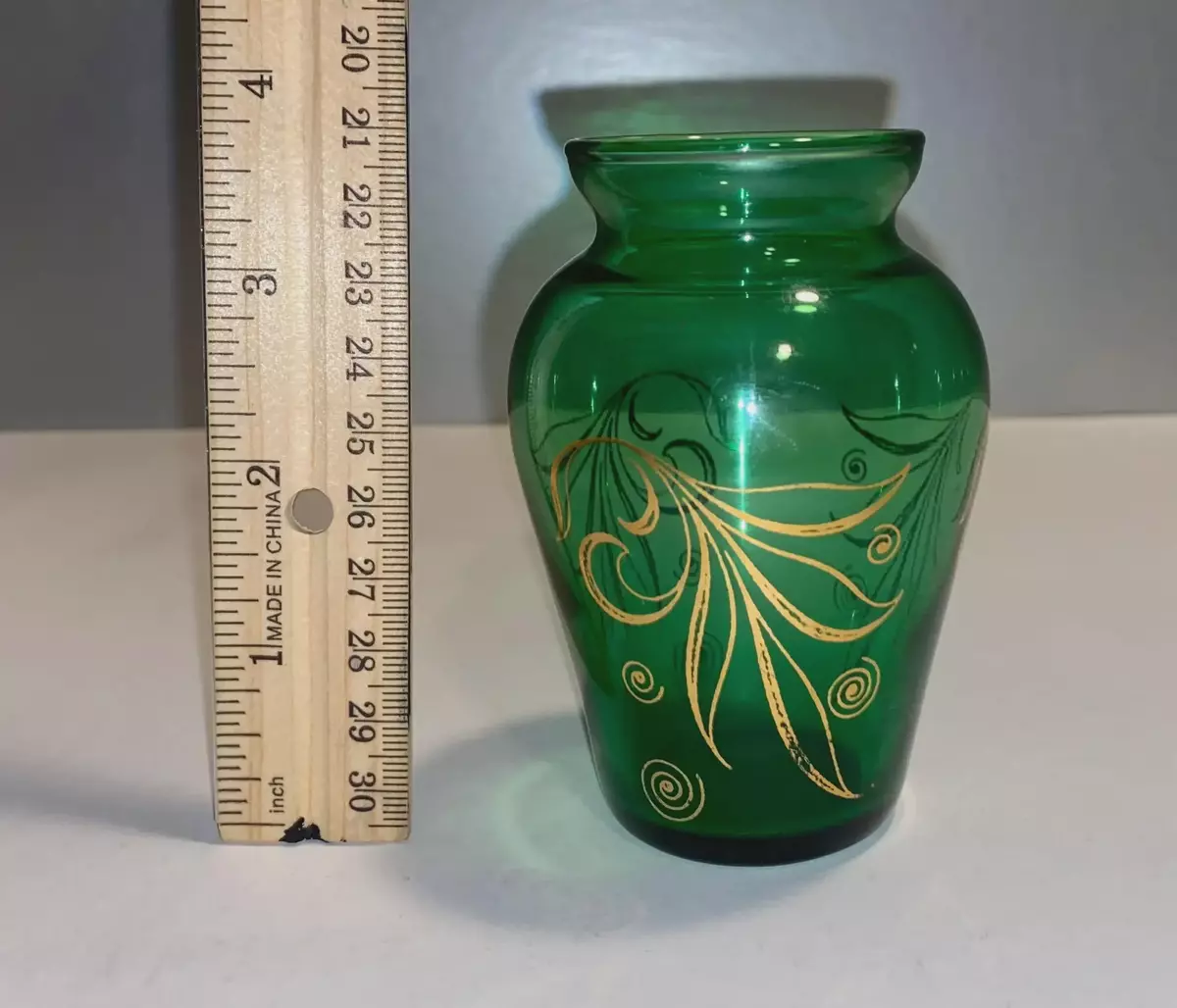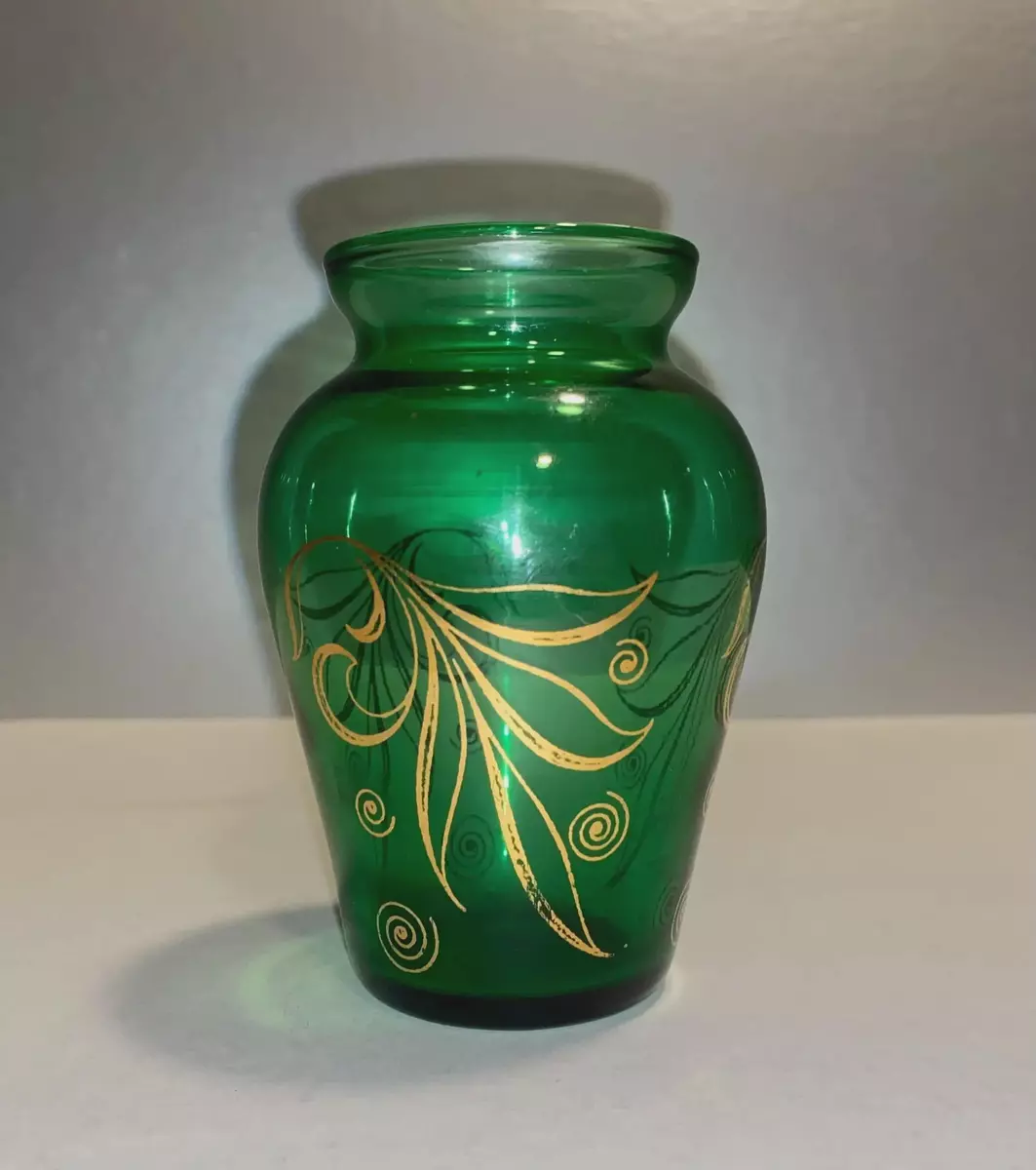 Add a touch of Mid-Century Modern charm to your space with this beautiful vintage Anchor Hocking bud vase. Crafted in their signature Forest Green glass, this piece features elegant gold leaf markings that wrap around the body. It's a cute and stylish vase perfect for a single bloom or as a standalone decorative accent. Refer to the images provided for more information on this lovely item.