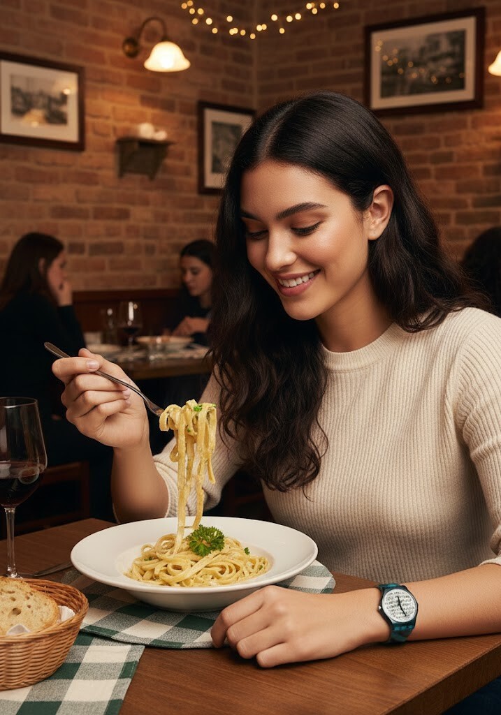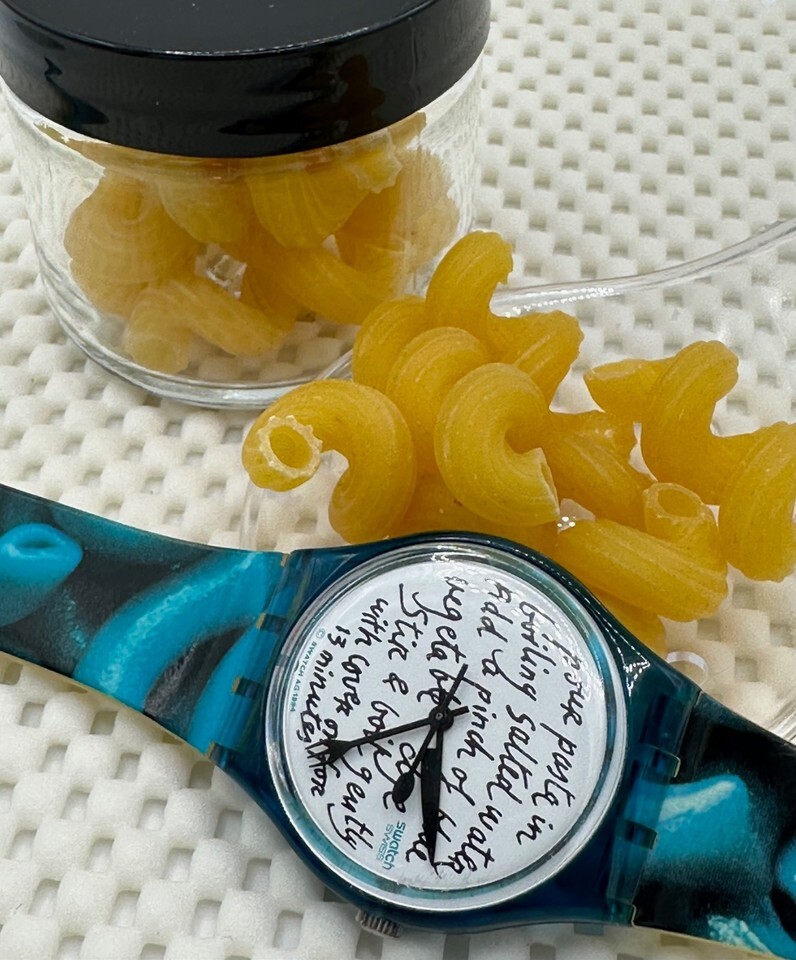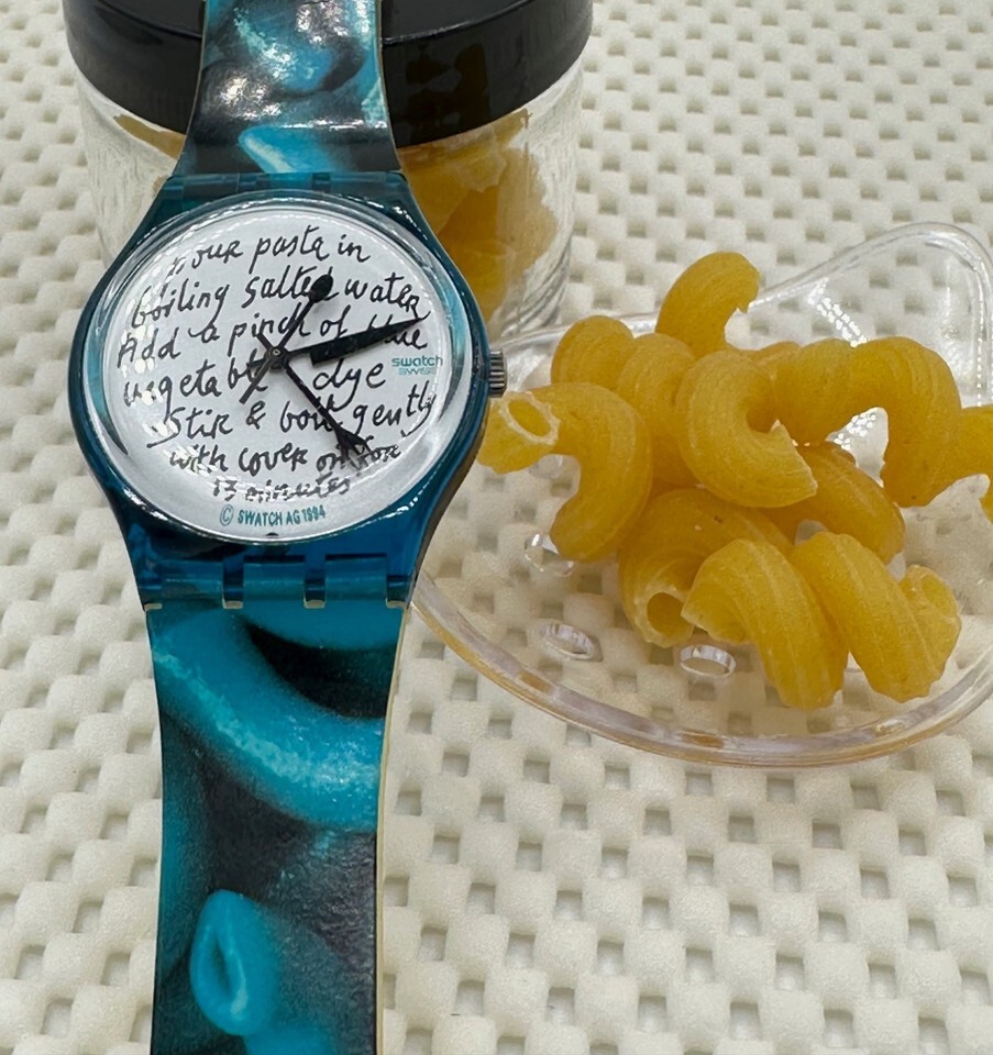The iconic fork knife hands and genuine Swatch structural fancy noodle-inspired strap turn every meal into a conversation.