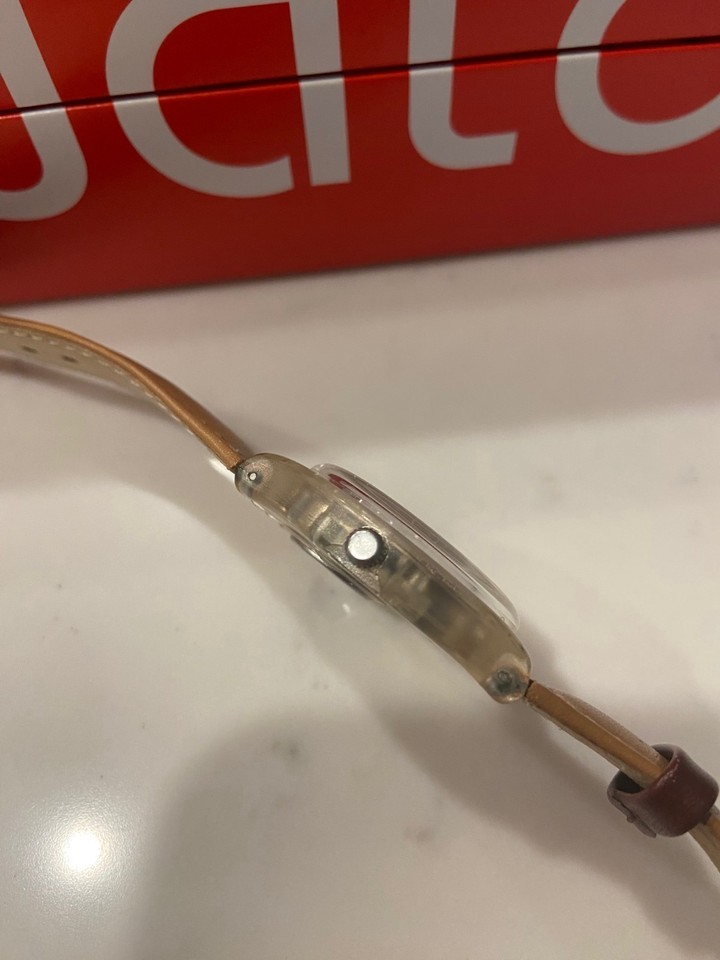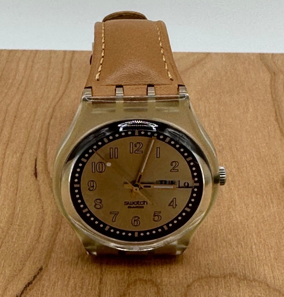 Genuine Swatch strap is leather, honey-brown in color with tang buckle.