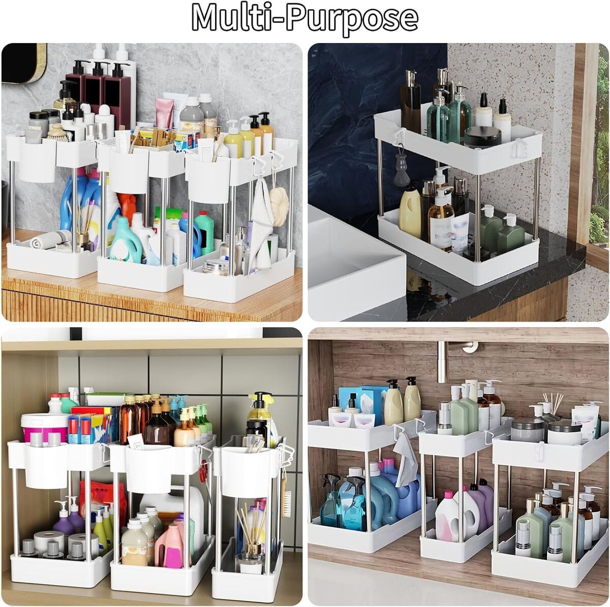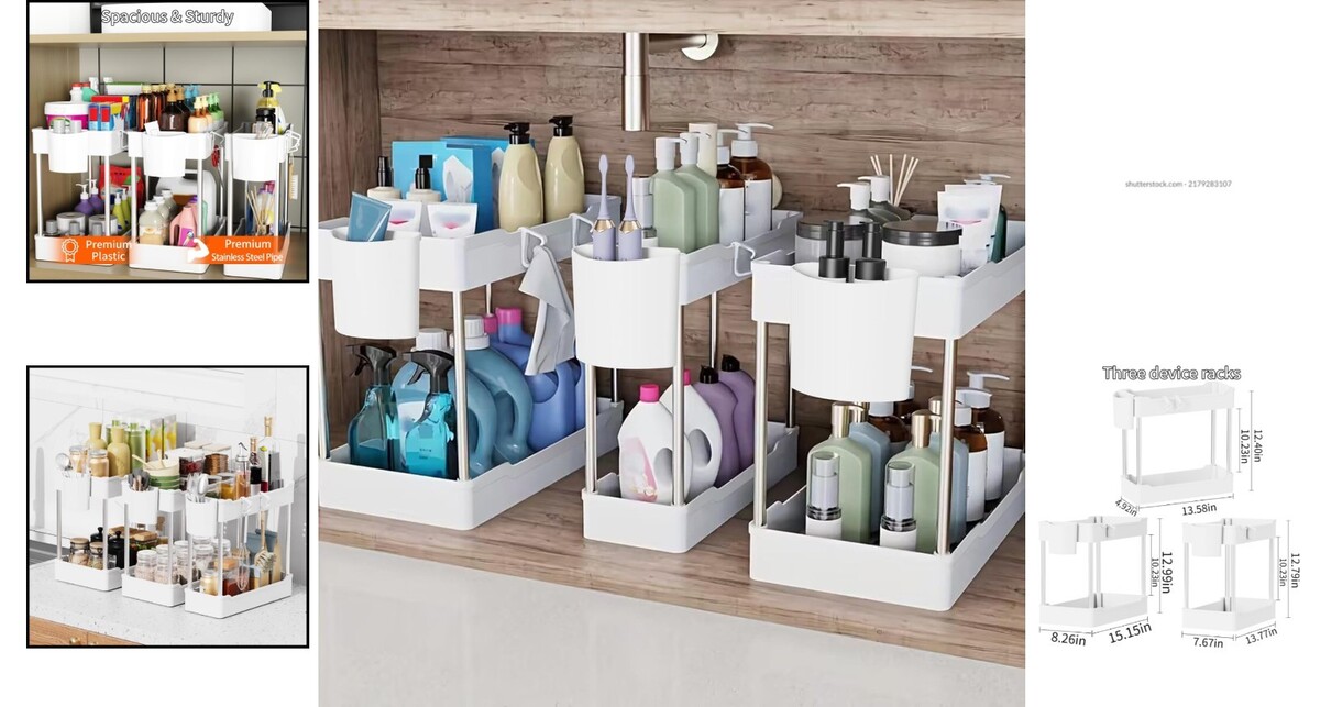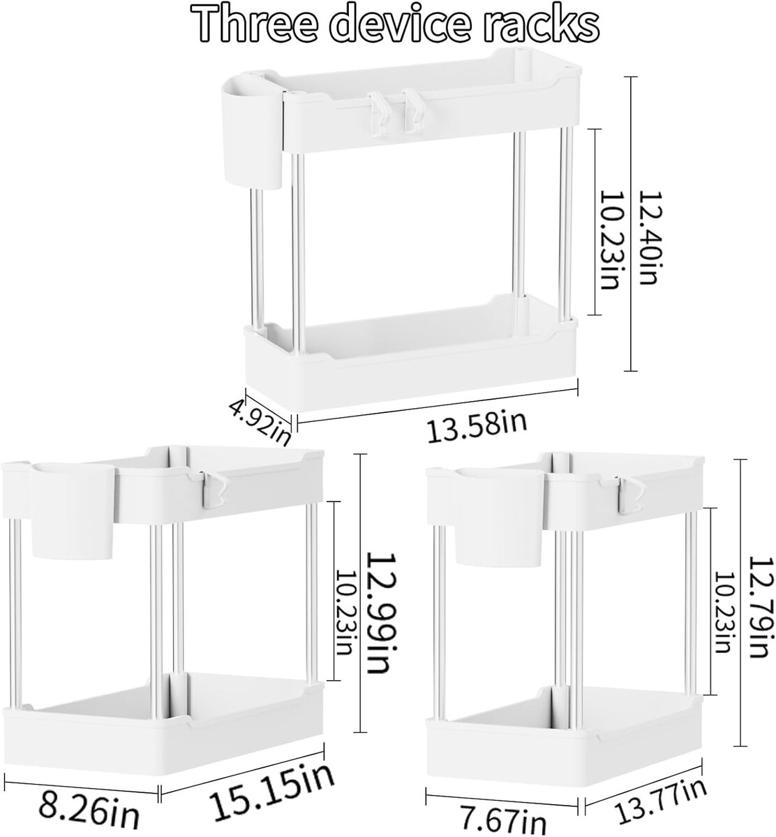 2 Tier White Under Sink Organizers - 3 Pack with Hooks and Detachable Cups