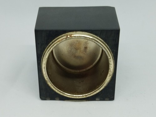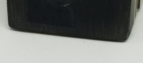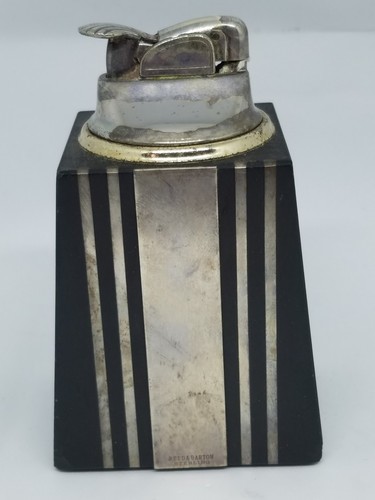 A vendre est un briquet en pierre noire Reed et Barton avec des lignes en argent sterling incrustees et appliquees. Le briquet a des eclats dans les coins inferieurs, voir photos et mesure 2,5" x 2" a la base. Le briquet mesure 4" de haut.