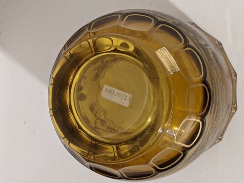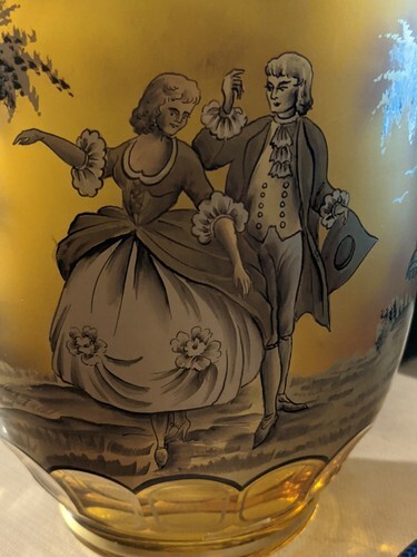 A vendre est un vase en cristal ambre peint avec des figures coloniales de l'Allemagne de l'Ouest des annees 1950 signe 8 pouces.