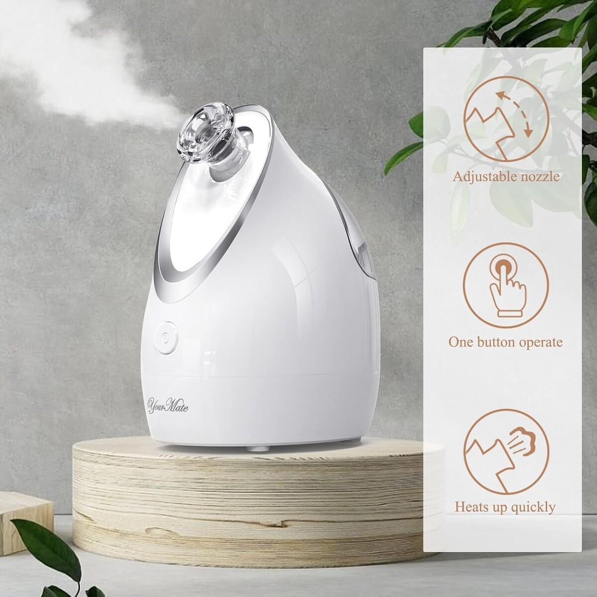 Features: Adjustable Nozzle,Nano-ion steamer,Aromatherapy,Soothing scent,Effective Moisturizing,Continuous heat mist,Skin improvement,Hydrated skin,Elastic skin,Decreased dryness,Lifetime customer support