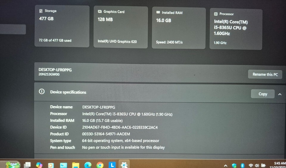 Intel Core i5 ~ 8365U @ 1.60GHz * 16GB Ram * 512GB NVMe