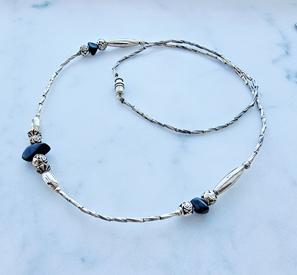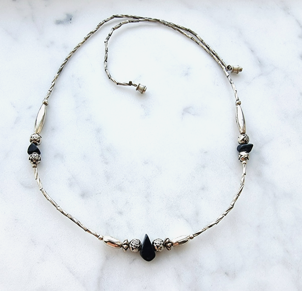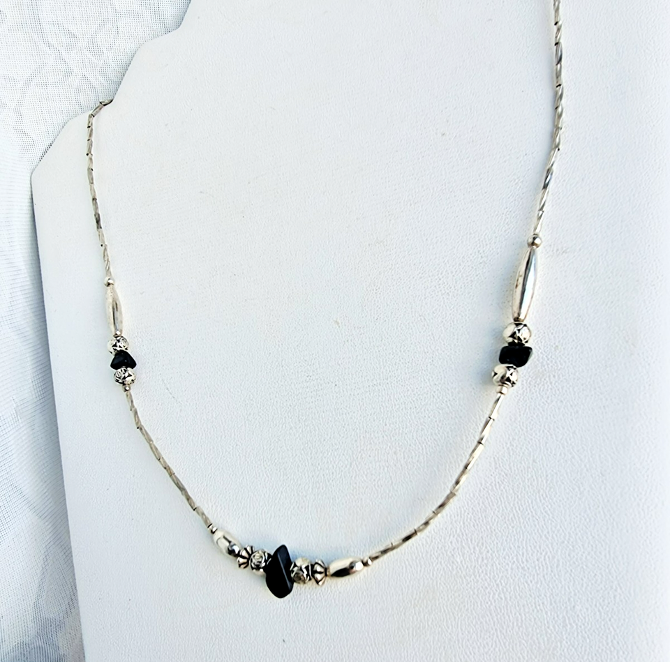 NATIVE AMERICAN NAVAJO VINTAGE 925 STERLING SILVER BLACK ONYX AND ROSES NECKLACE