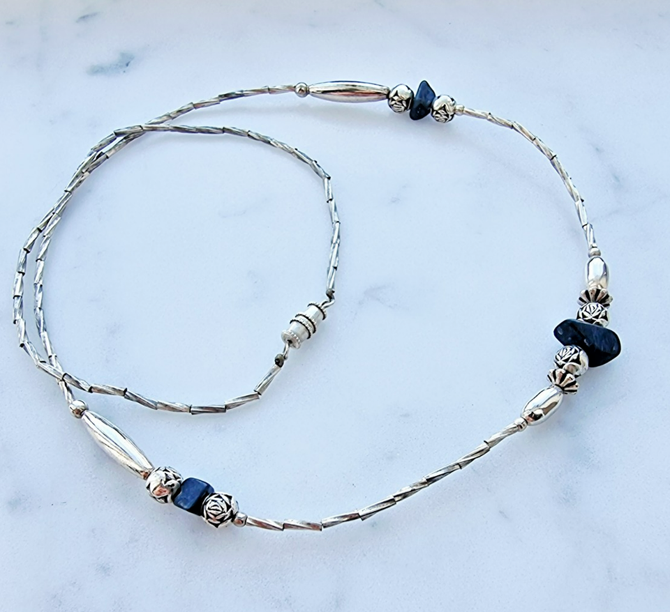 The Native American Navajo Vintage 925 Sterling Silver Black Onyx and Roses Necklace is a handmade piece crafted by Navajo artisans in the United States. This exquisite necklace showcases traditional Navajo design elements, such as the use of black onyx and intricate rose motifs, reflecting the beauty and cultural significance of Native American jewelry. Perfect for collectors or those looking to add a unique and meaningful piece to their jewelry collection, this necklace embodies the rich heritage and craftsmanship of the Navajo tribe.