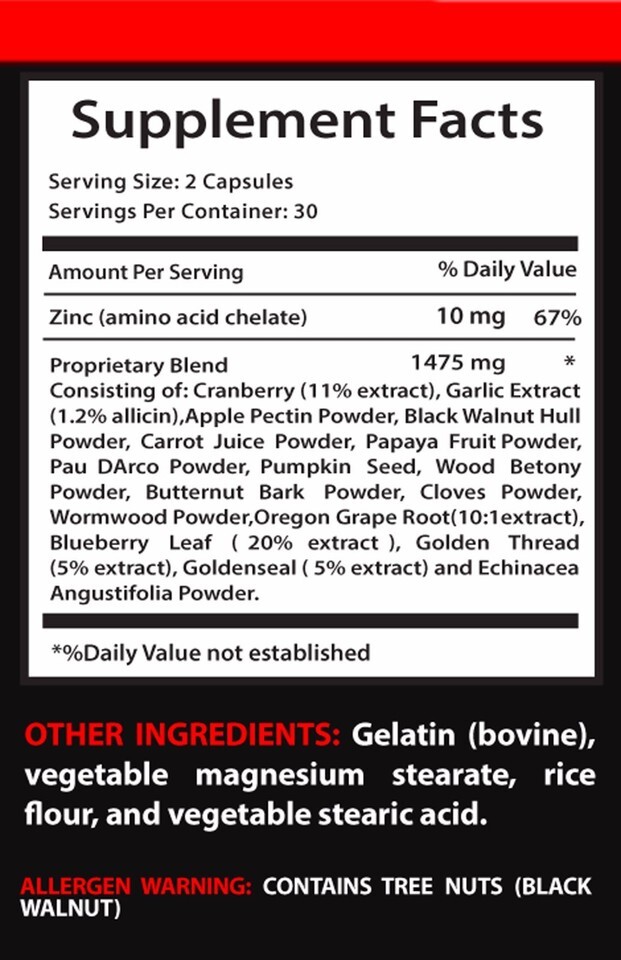 Consisting of: Cranberry (11% extract), Garlic Extract (1.2% allicin),Apple Pectin Powder, Black Walnut Hull Powder, Carrot Juice Powder, Papaya Fruit Powder, Pau DArco Powder, Pumpkin Seed, Wood Betony Powder, Butternut Bark Powder, Cloves Powder, Wormwood Powder,Oregon Grape Root(10:1extract), Blueberry Leaf(20% extract),Golden Thread (5% extract), Goldenseal(5% extract) and Echinacea Angustifolia Powder.