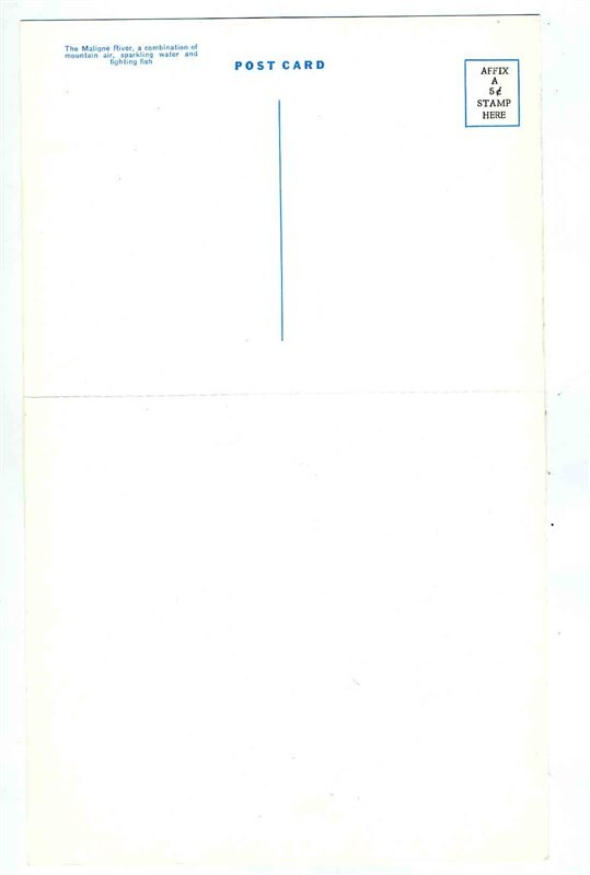 A Dinner menu from the Jasper Park Lodge, Canadian National System. A Dinner Menu dated August 12, 1966. The Menu has a image of Fishing on the Maligne River in Jasper National Park. From the Jasper Park Lodge in Jasper, Alberta, part of the Canadian National System. A single page menu printed on heavy stock and measures about 6 1/2" x 10 1/2" . The top part of the menu with the color picture can be removed and used as a postcard.