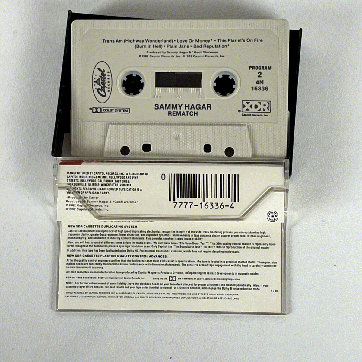 Discover the high-energy rock of Sammy Hagar with this vintage Rematch cassette. This release from Capitol Records features a compilation of some of Hagar's most electrifying tracks, showcasing his powerful vocals and songwriting prowess that cemented his status as a rock icon. Recorded with Expanded Dynamic Range (XDR) and Dolby System, this cassette offers a high-quality audio experience, bringing the raw energy of Sammy Hagar's music to life.