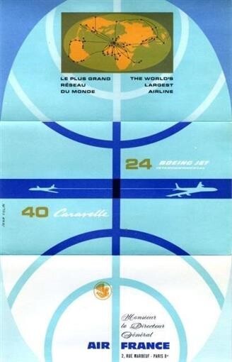 An unused Air France Passenger Comment Form, dated February 1964 and in near mint condition. In 4 languages, opens to about 13" x 7". Has a International Route map and notes that Air France had 40 Caravelles and 24 Boeing Intercontinental Jets.