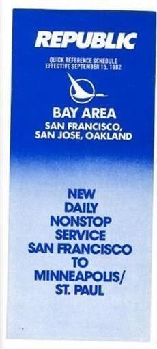 A Republic Airlines Quick Reference Schedule effective September 15, 1982 . Includes the Bay area airports of San Francisco, San Jose and Oakland. In fine condition.