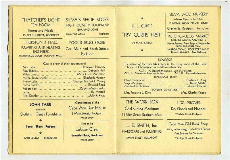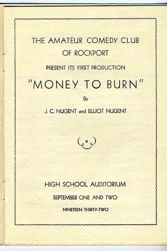A Program from The Amateur Comedy Club of Rockport present its first production MONEY TO BURN by J C Nugent and Elliot Nugent. Performances on September 1 nd 2, 1932 in the High School Auditorium. * pages in a heavy card cover. In near mint condition. With Cast List, Synopsis, local Ads, list of patrons and more. With a wonderful drawing of a ship on the cover. Massachusetts