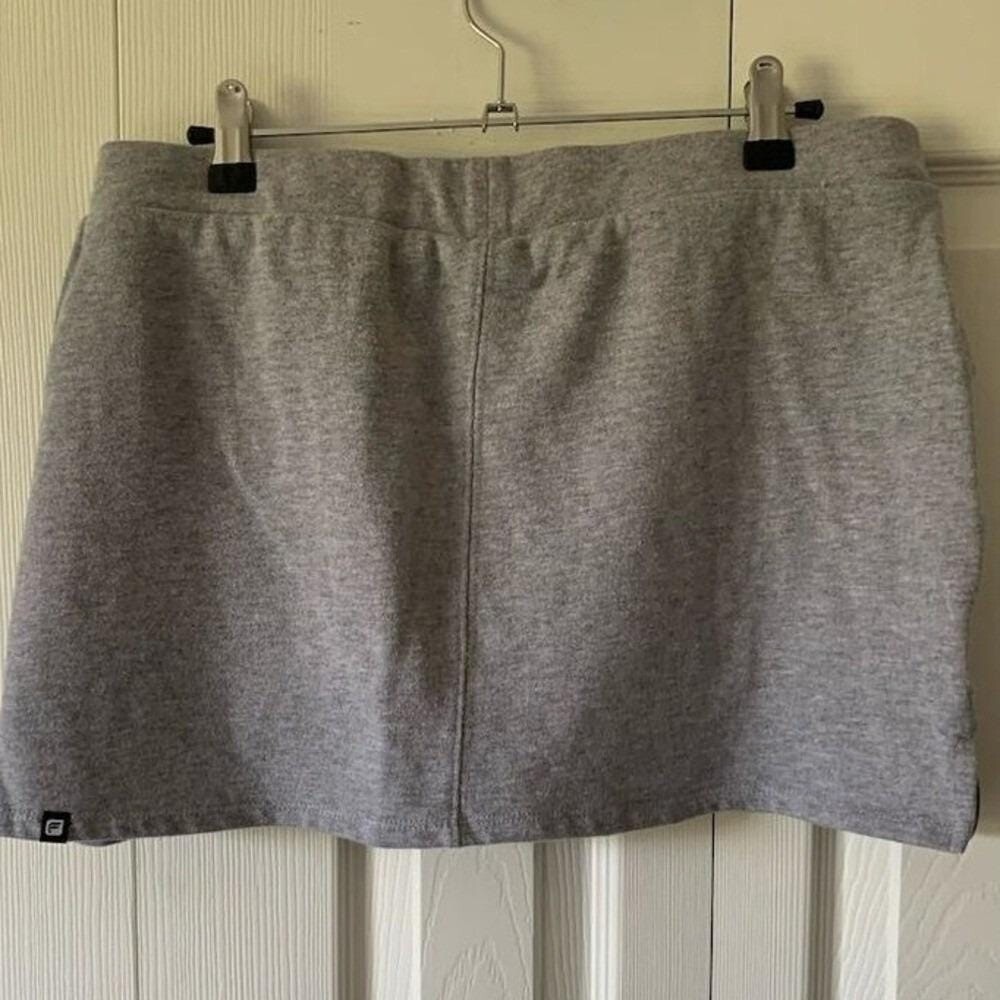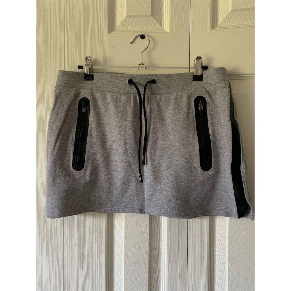 Keywords: Fabletics skirt, women's skirt, gray skirt, pencil skirt, casual skirt, short skirt, drawstring waist, zipper pockets, leather detail, knit fabric, machine washable, pre-owned skirt, women's fashion, all seasons, medium size.