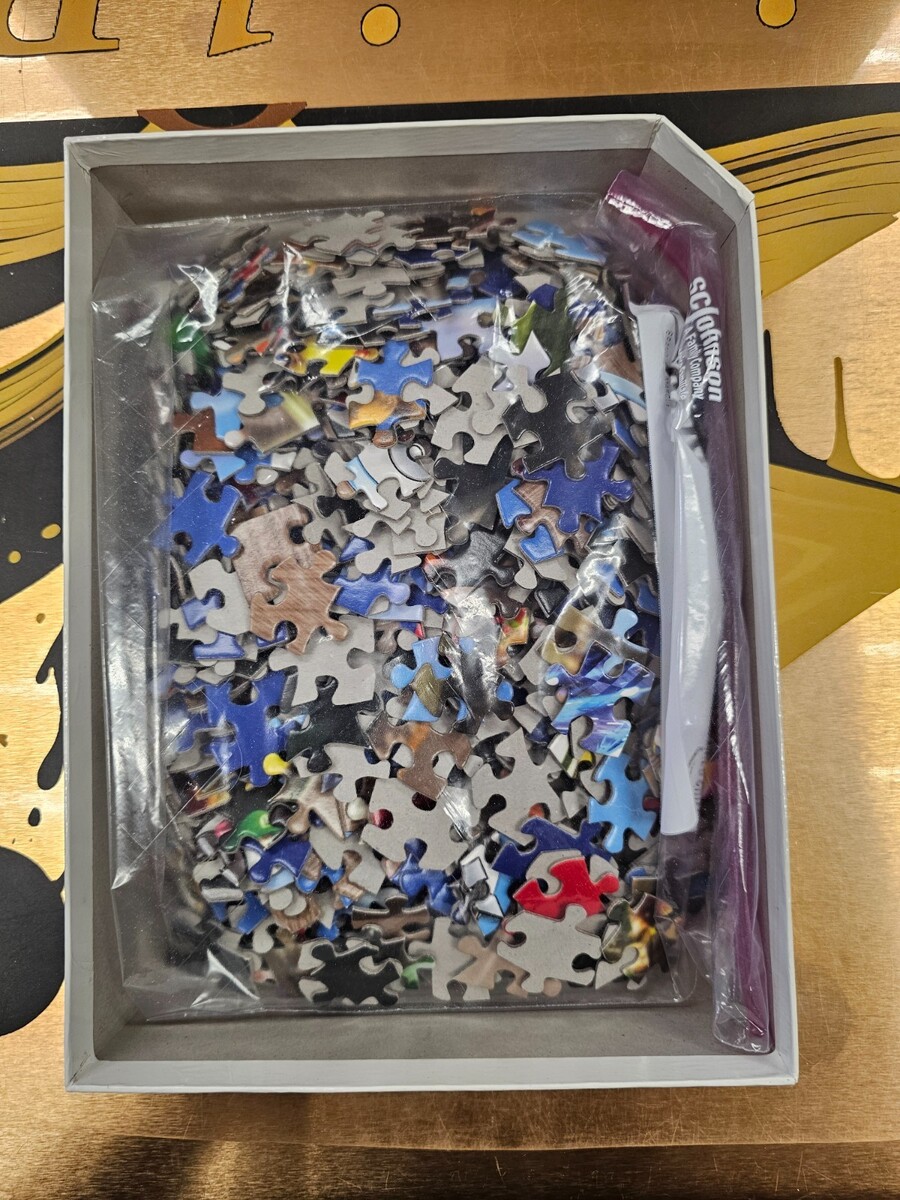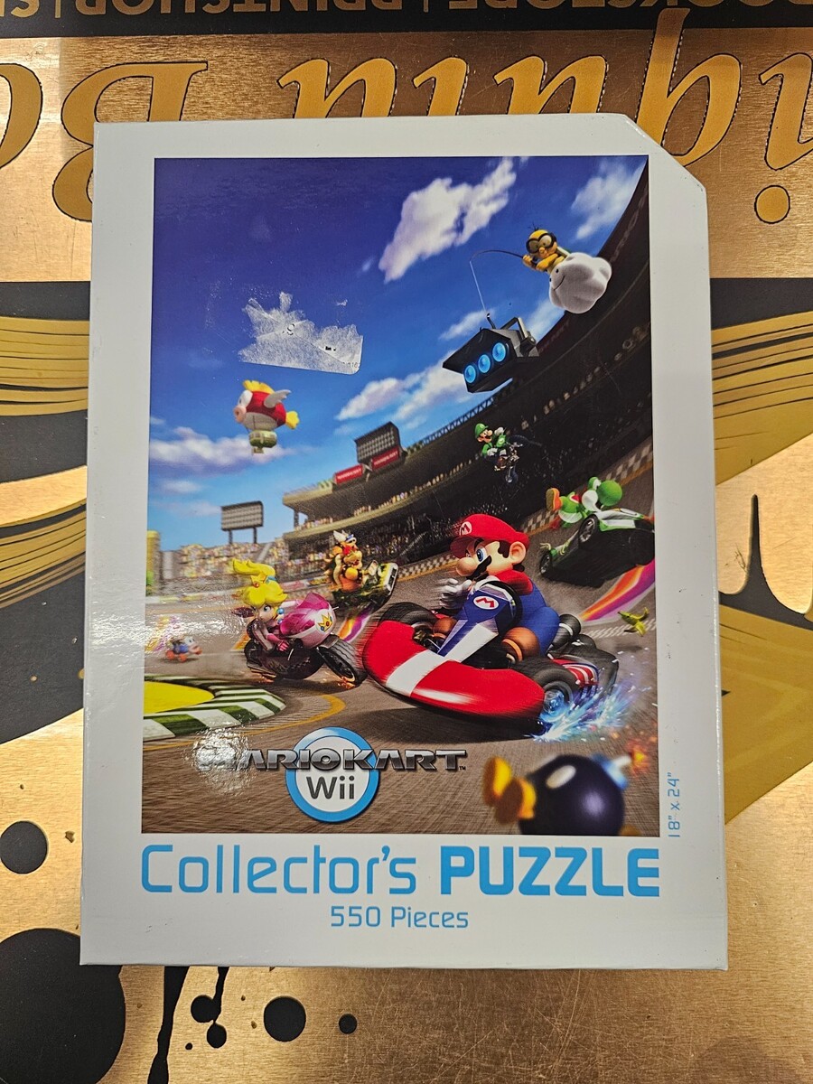 franchise. This puzzle, released in 2008, includes 500-749 pieces made of cardboard and showcases a white color scheme. The puzzle is themed around video games and was made in the United States. Perfect for fans of Nintendo and the Mario Kart series, this jigsaw puzzle is a fun and challenging activity for puzzle enthusiasts.
