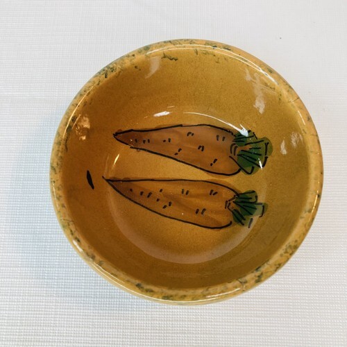 Adorable little souvenir handmade and handpainted bowl from the Hotel Modenese in Italyz. Marked 1985 on bottom. Is a golden brown color with carrots painted inside the bowl. Super cute piece!