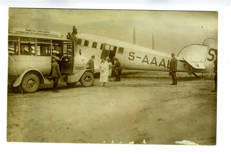 An unused real photo postcard of a Bus Picking Up Passengers deplaning from a Junkers Airplane at Berlin Templehof Airport in 1924.
