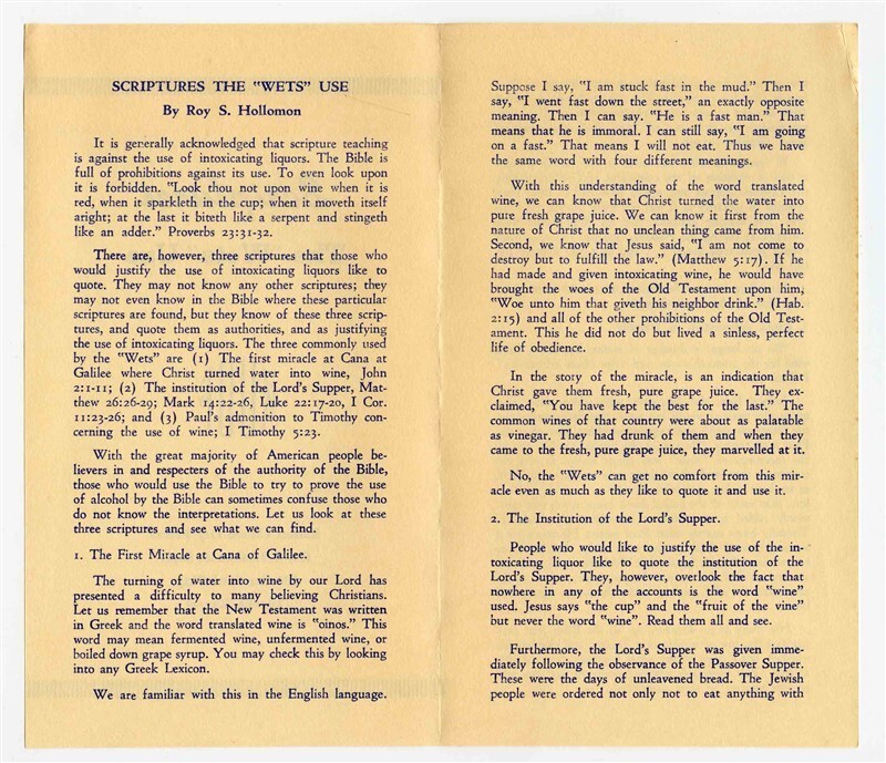 A 4 page brochures used in the 1948 Kansas elections on the legalization of Liquor Stores . Kansas has the strictest liquor laws in the United States and has still not ratified the 21st Amendment which ended nationwide prohibition in 1933. Scriptures the Wets Use. A close look at the references to wines in the Bible. Published by the Kansas United Dry Forces of Topeka,