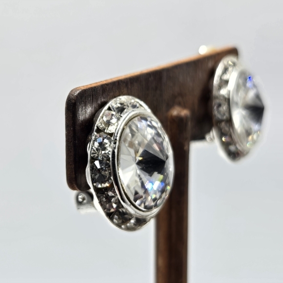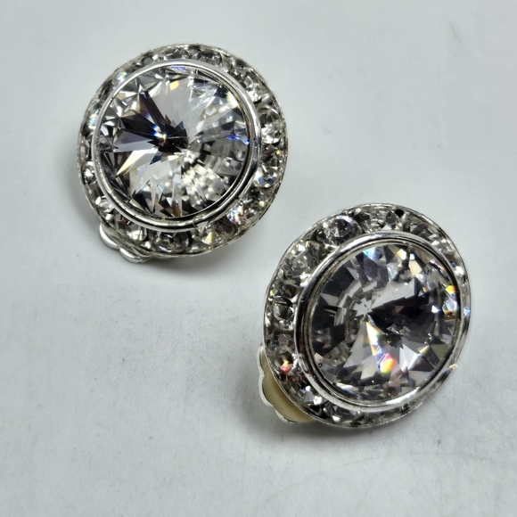 Vintage Estate 80's Clear Rhinestone Silver Tone Rivoli Clip-On Earrings Circle Round Stud Statement Metal Fashion Costume Collectable