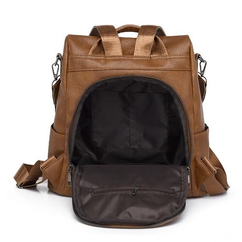 It has a detachable strap and a shoulder strap handle style, both made of polyester and leather. The hardware color is silver and the bag has accents in the form of a zipper. This backpack is perfect for travel, party/cocktail or casual occasions and it has an anti-theft feature. It is vintage in style and has a solid pattern. The lining material is made of leather and fabric with a brown color, and the exterior material is leather.
