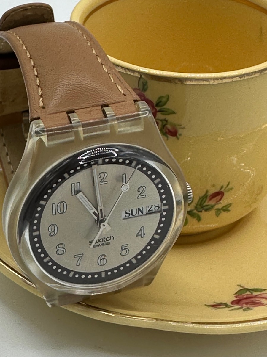 Genuine Swatch leather strap, honey-brown in color with tang buckle.