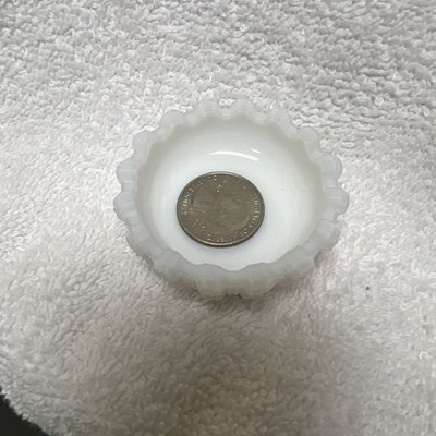 Vintage Westmoreland Lacy Daisy Milk Glass Open Salt Cellar Dip Sticker Tag. Very good unused condition round patterned milk glass open salt measures approx. 1 1/4" tall and 2 1/4" wide, no damage to edged pattern, no chips, cracks. Original black and gold Westmoreland Glass sticker tag. See pictures.