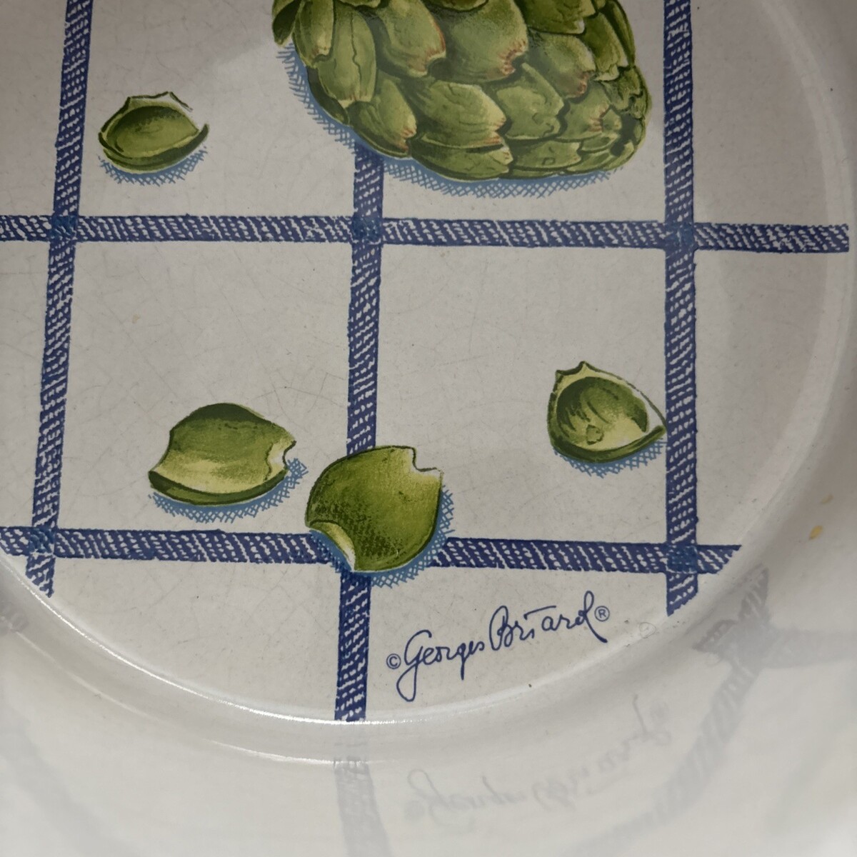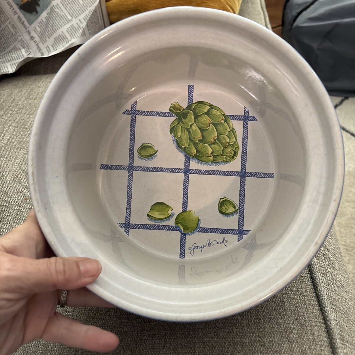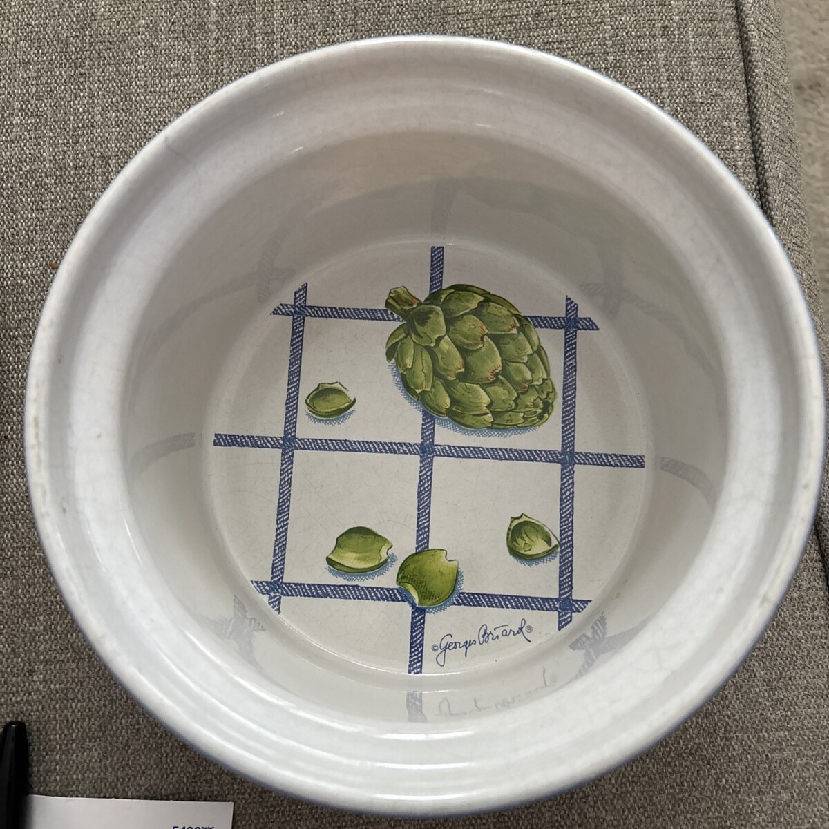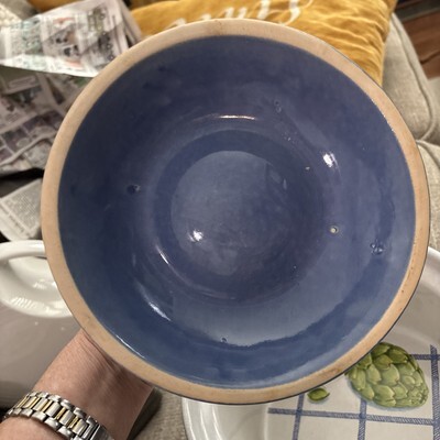 This vintage Georges Briard signed casserole baking dish from the 1970s features a solid blue color on the outside with an artichoke deaign on inside. Made of glazed pottery and measuring 8 inches in diameter and 5.5 inches in depth, this round dish holds up to 2 quarts of food. The glossy finish and painted backstamp add to its collectible appeal, making it a unique and stylish addition to any kitchen or dining table.