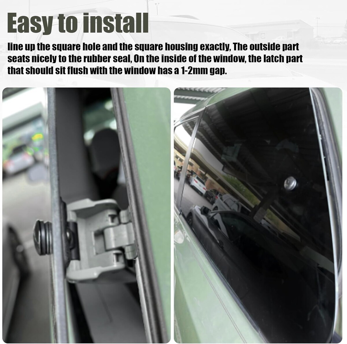 Easy to install: The rear window latch bolt nut screw exactly what needed to repair our sienna Van side windows and sienna rear window, that opens and closes with a dashboard switch, line up the square hole and the square housing exactly, The outside part seats nicely to the rubber seal, On the inside of the window, the latch part that should sit flush with the window has a 1-2mm gap.