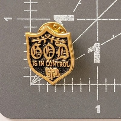 God Is In Control Christian Faith Shield Black Gold Enamel Pin Religious Message