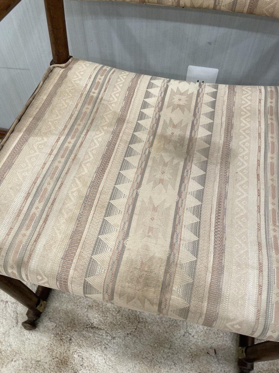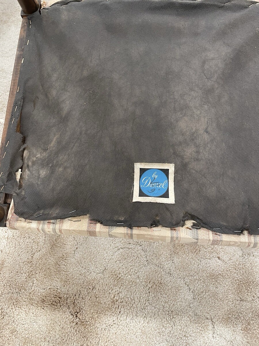 For sale is a vintage wood and fabric armchair made by Drexel Furniture. Some areas of light stains to the fabric. Needs a good polishing.
