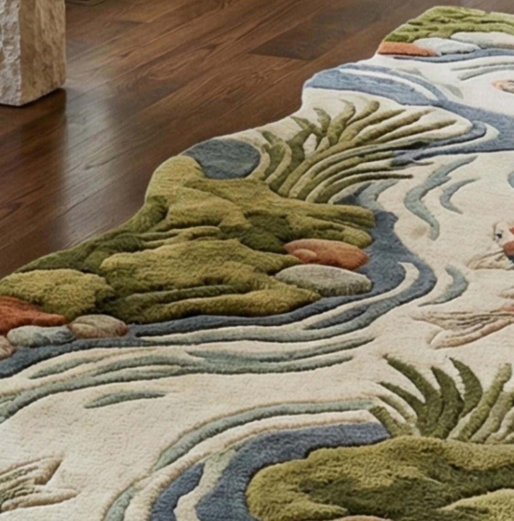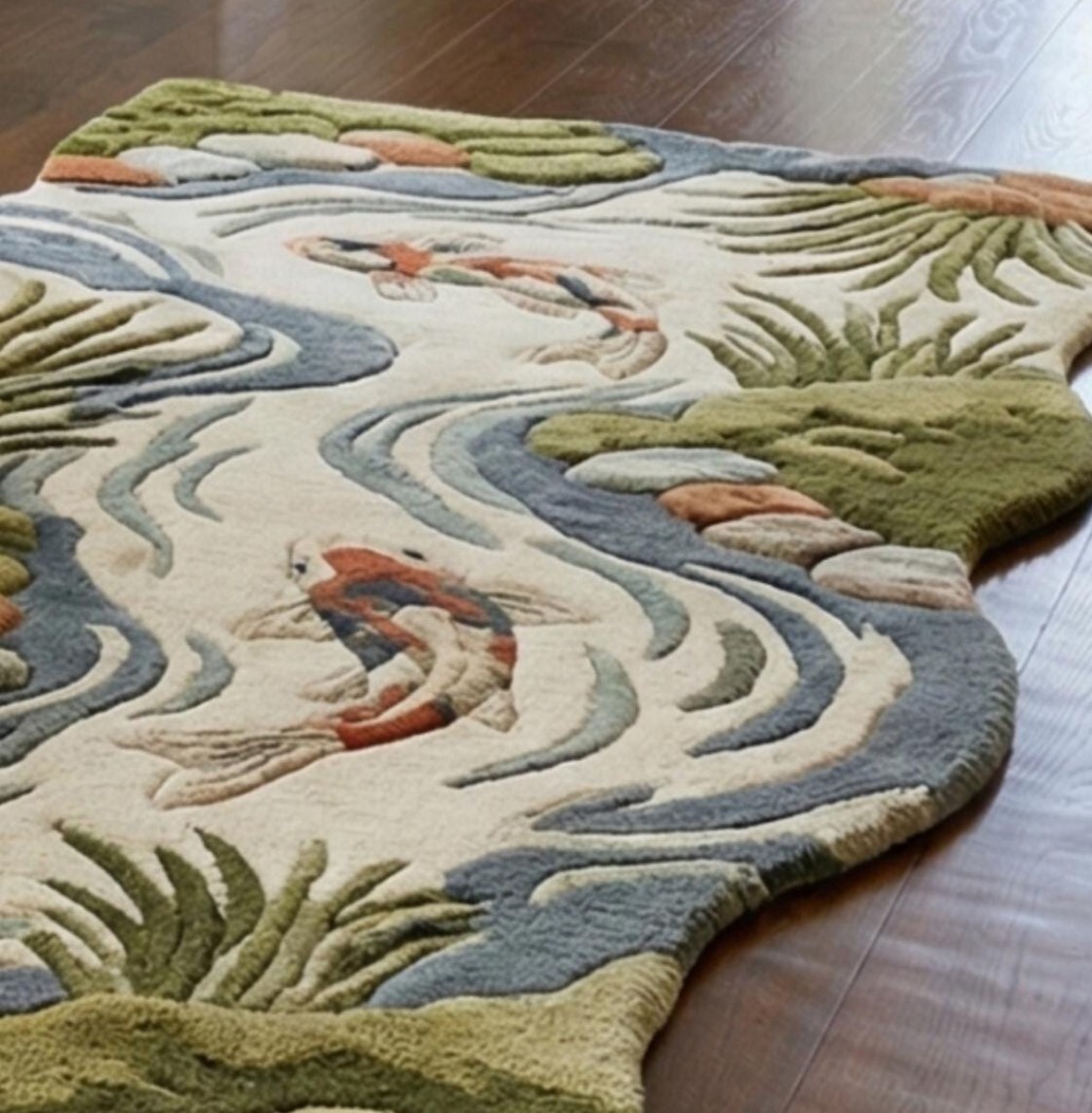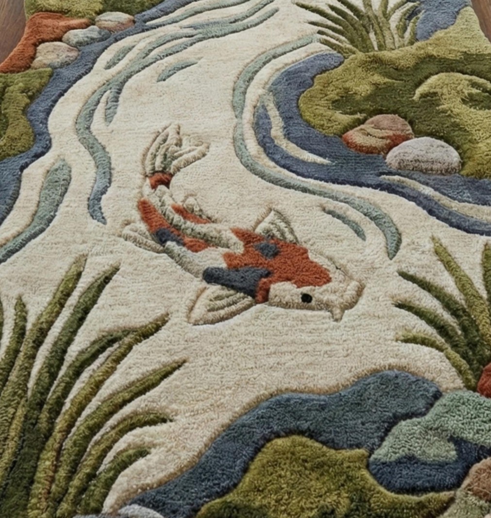 Premium hand tufted runner rug crafted from 100% wool with cotton canvas backing and natural latex support. Features artistic koi fish and flowing stream design with carved texture. Soft, durable, and ideal for hallway, entryway, or living spaces. Easy maintenance.