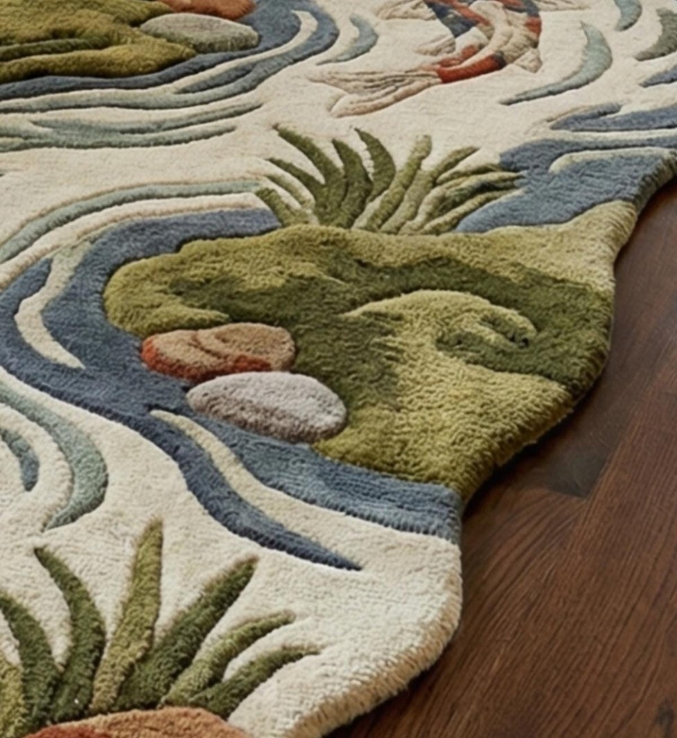 Koi Pond Scenic Hand Tufted Wool Runner Rug Nature Stream Designer Wool Tufted R