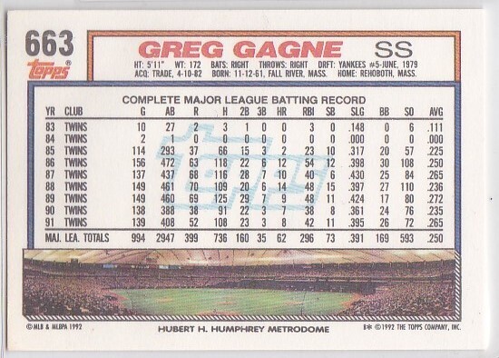M) 1992 Topps Baseball Trading Card - Greg Gagne #663