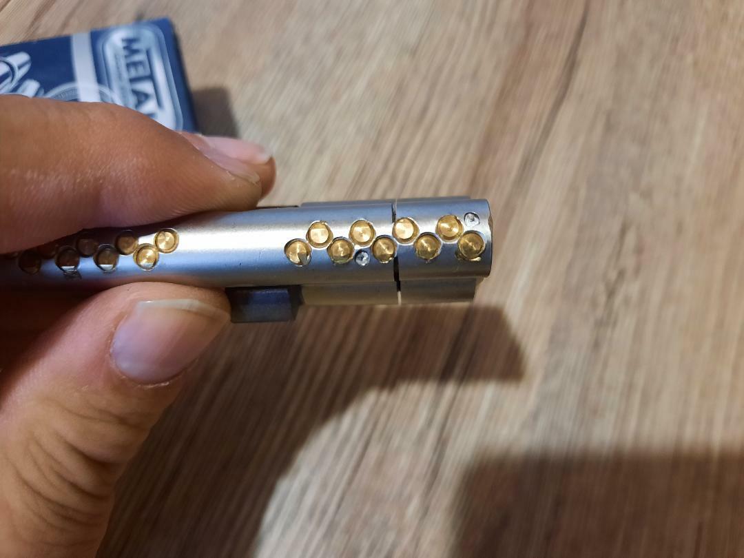 Security cylinder ?9J2x1? ?Metalguard? The cylinder has nine locking pins points with reversible dimple key. ?Metalguard? are registered trademark. The key design and key profile is protected. Complies with the class 5 by EN 1303. Anti-snap protection (cut in the housing and the rotor in a selected section, near to the outside of the housing), ensuring that the cylinder will continue to work even after improper breakage. The cylinder housing and plug are made of brass and satin (E) plated. Two-row arrangement of the main locking pins. Additional pins on the top row to increase the security of the locking. Pins anti-drilling is made of hardened steel and are before and after the weakened section for breakage. The CAM is made of sintered steel according BDS 6977-84 or din 18252. Four keys ma