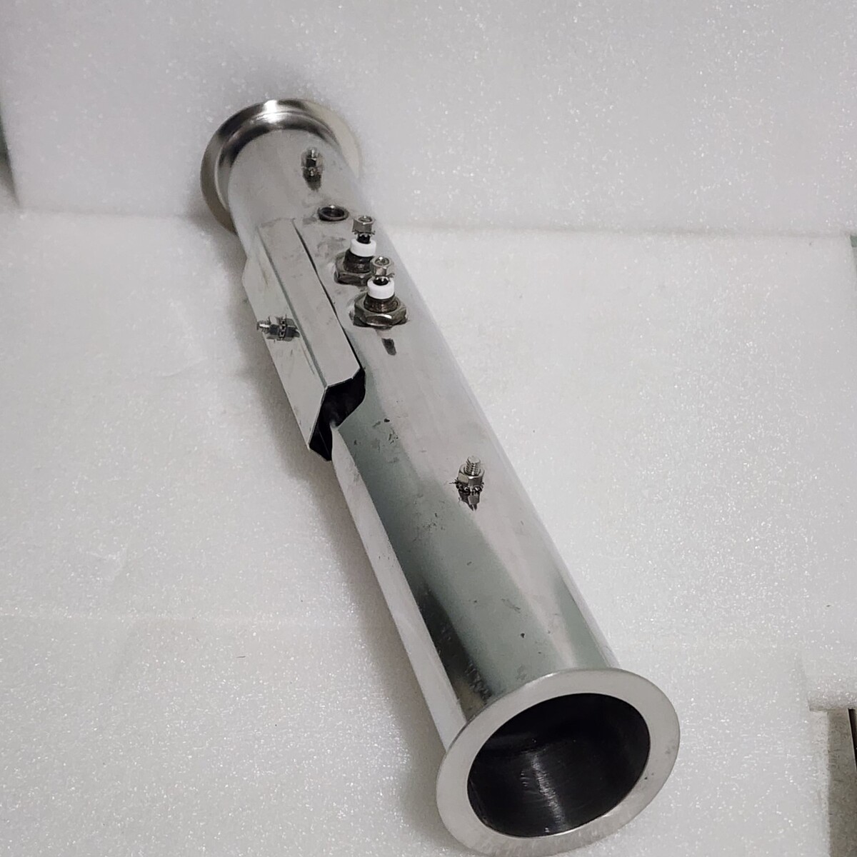 PRODUCT DIMENSION: The flow-thru spa heater stainless steel manifold size 2in x 15in. The split nuts unions diameter of 2in