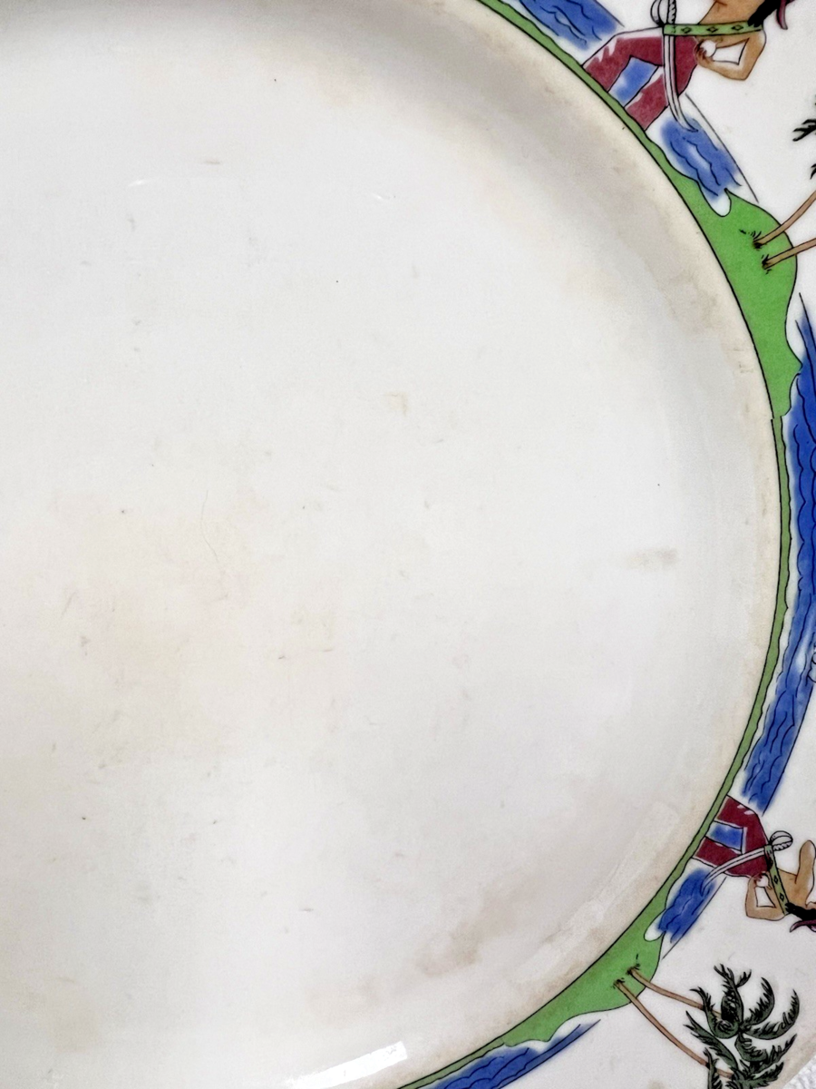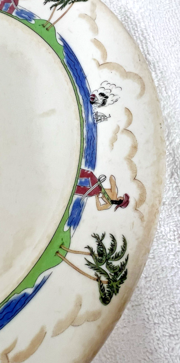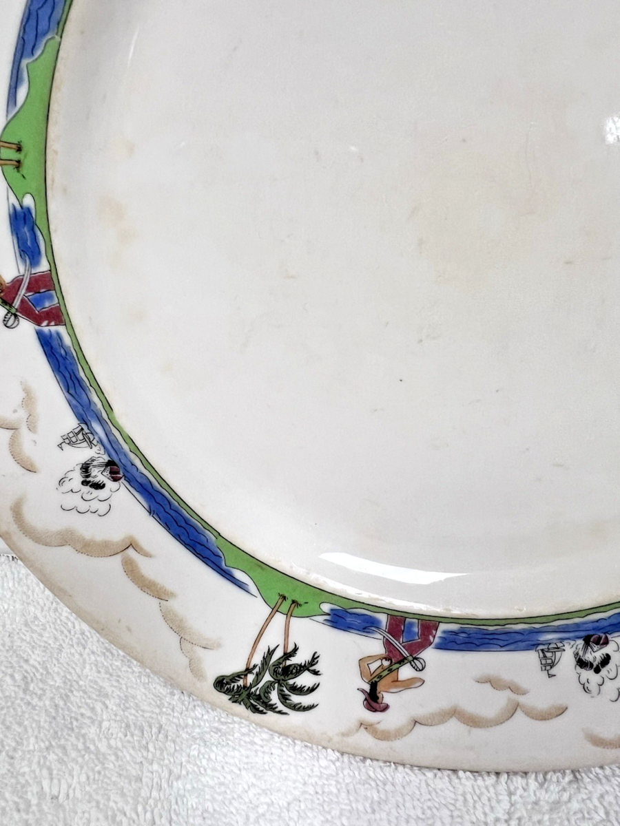 Vintage Illinois Central Railroad Pirates Ships Attacking Ships Palm Trees Sea Border Pattern measures approx. 9.75" Dinner Plate. Well used dinner plate, some staining edges and inner rim have yellowing, no chips, cracks, pattern used exclusively by the Illinois Central Railroad. See pictures.