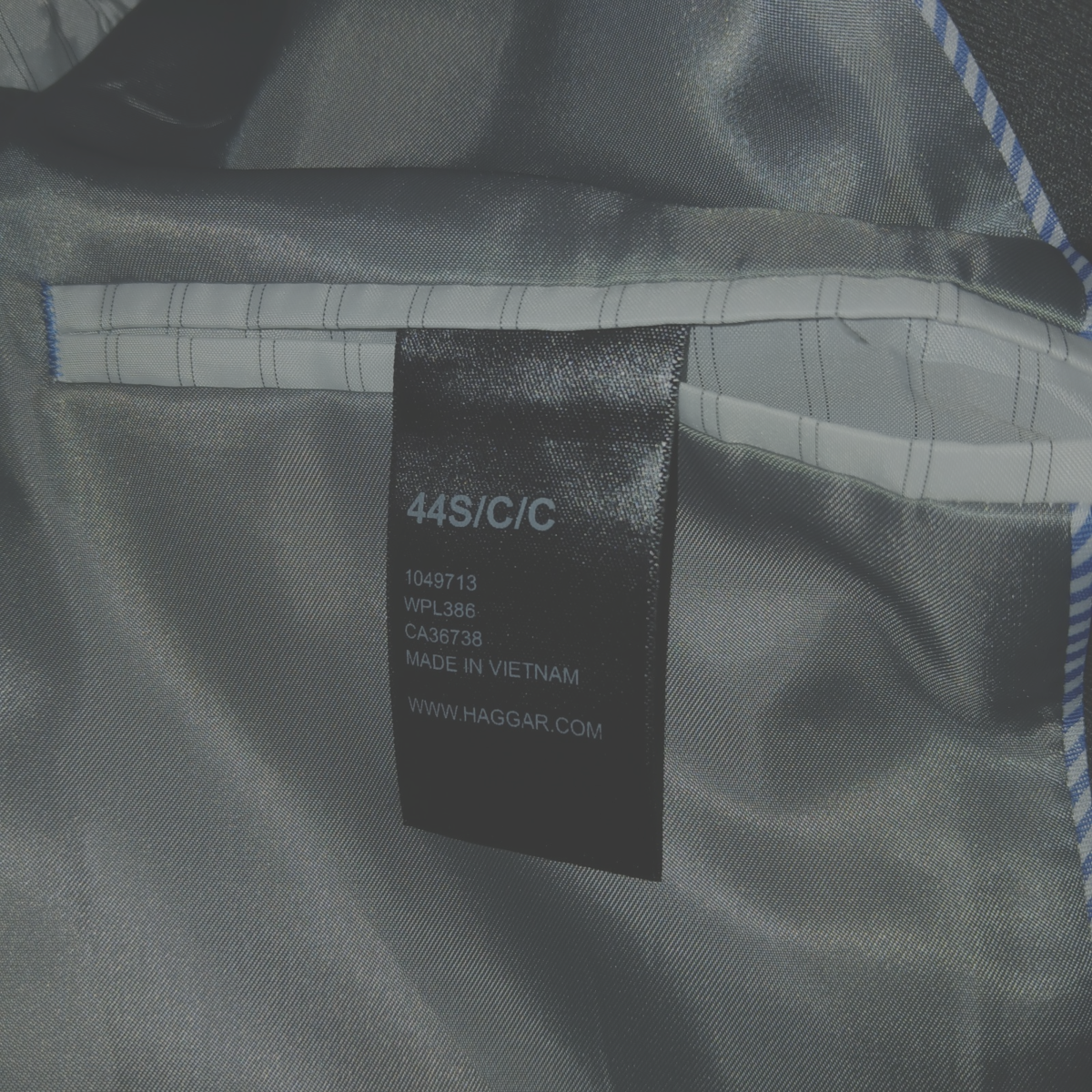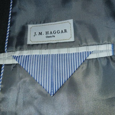 THIS IS A VERY NICE J.M. HAGGAR MEN'S STRETCH GRAY SPORT-JACKET IN A SIZE 44 SHORT. IT IS NEW, WITHOUT THE TAGS--BACK PLEAT STILL TACKED SHUT.