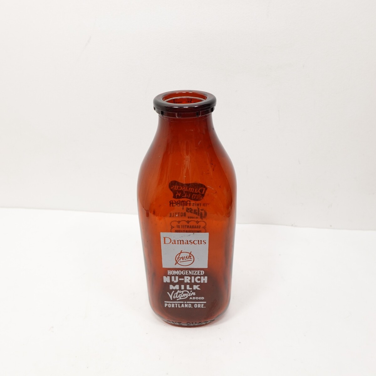 Vintage Damascus Milk Co. 1-quart amber glass bottle from Portland, Oregon. Features white and red ACL (Applied Color Label) graphics with ?Damascus Fresh Homogenized Nu-Rich Milk ? Vitamin Added? on the front and ?In This Amber Glass Bottle Is Your Guarantee of Protected Flavor? on the reverse. Marked ?Duraglas? on the base.