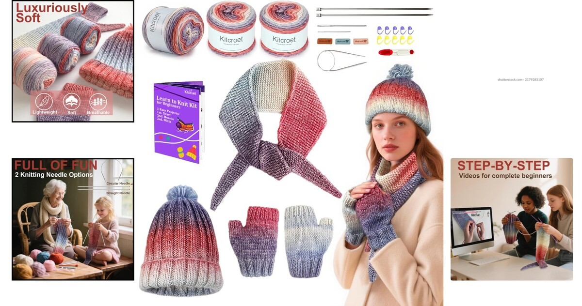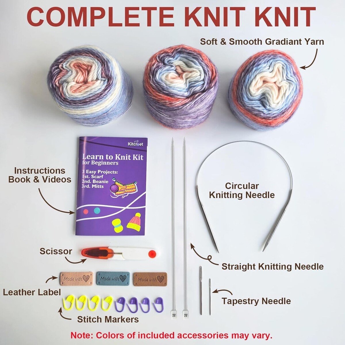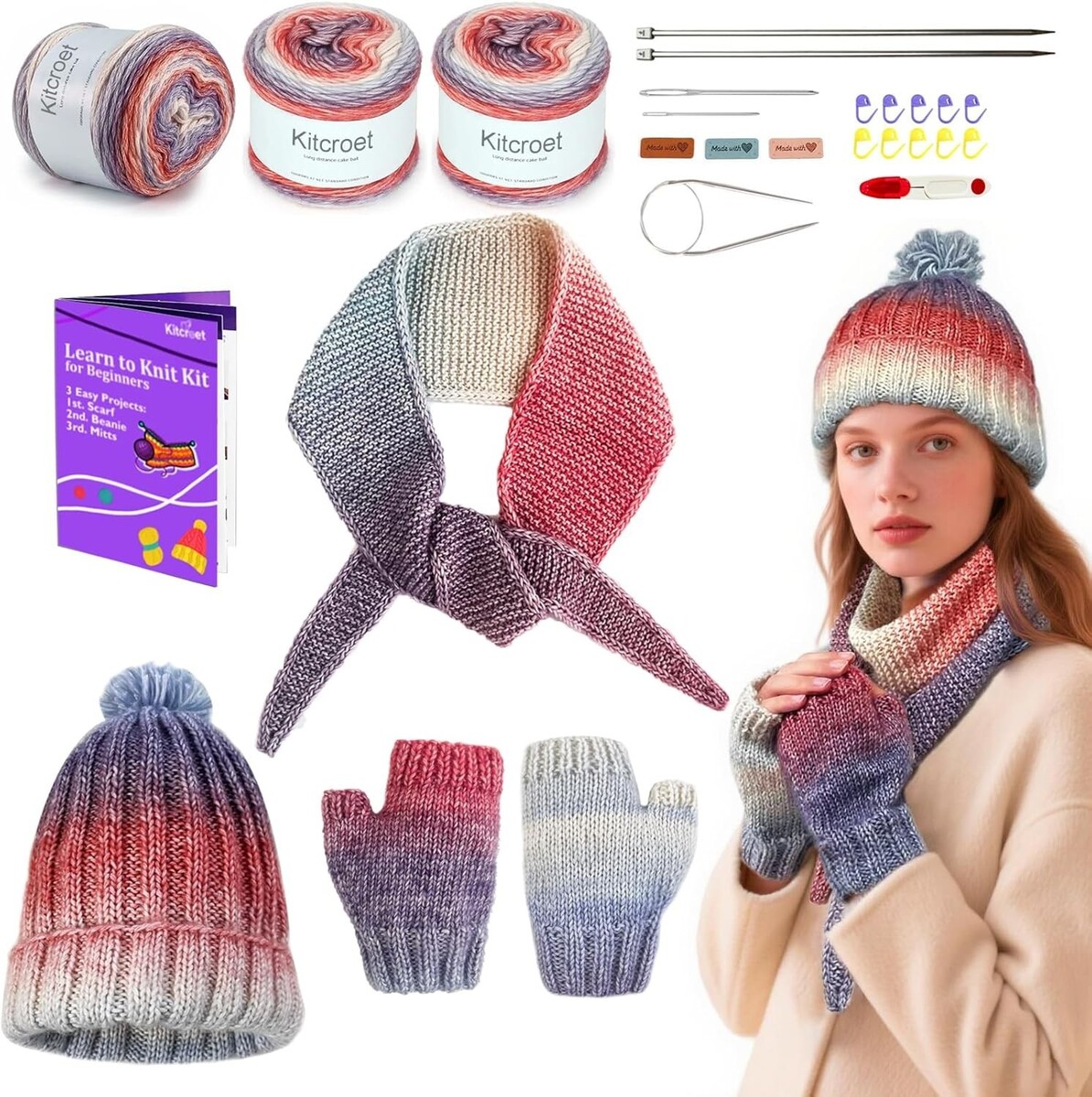 This three-pack knitting kit is beginner-friendly and comes with detailed instructions and demonstrations.