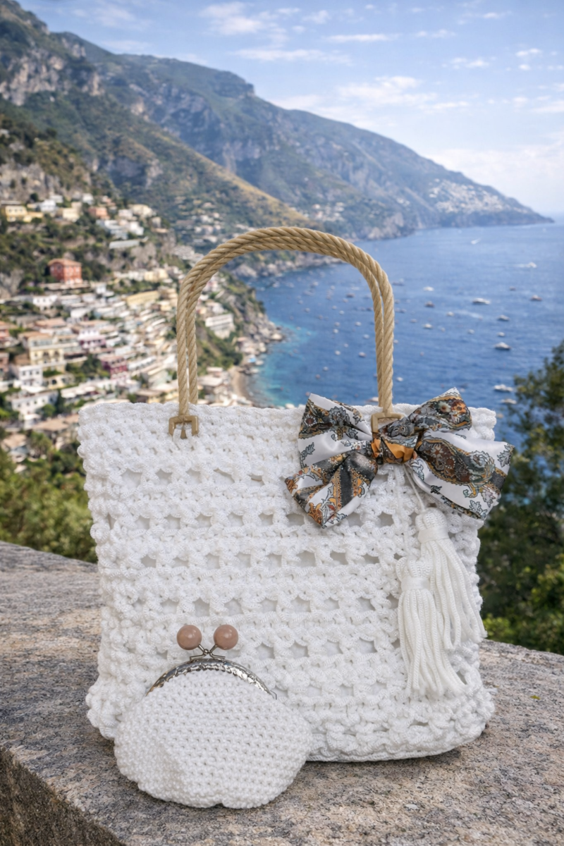 A romantic handmade bag in ecru, inspired by the colors and atmosphere of the Mediterranean.