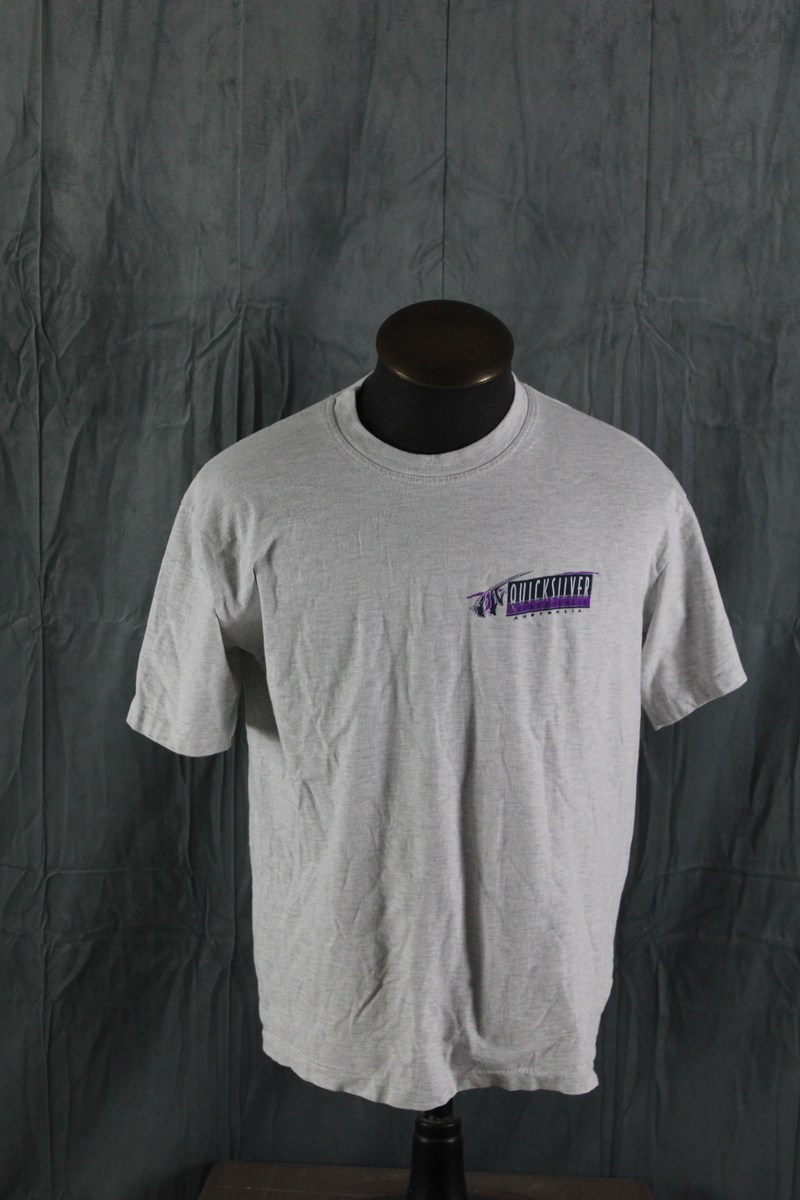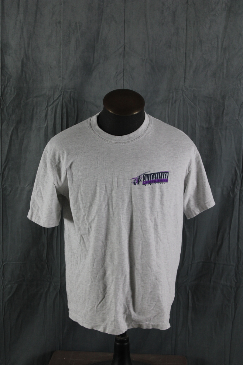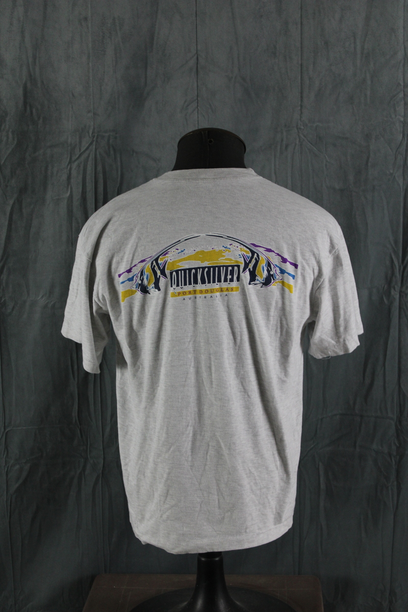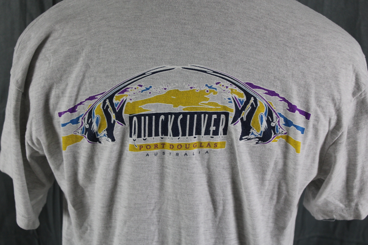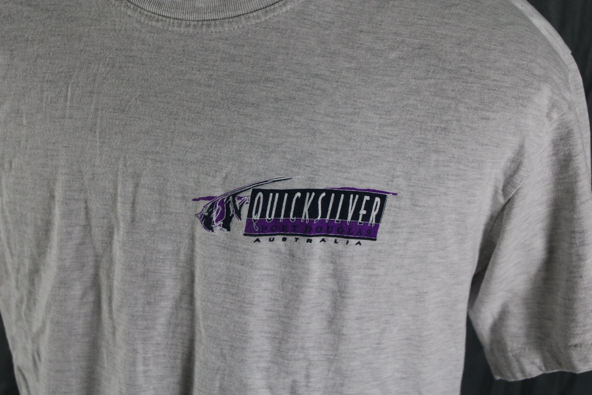 Up for sale is a vintage tourist shirt. It has a grey base colour with a graphic of a tropical fish and Quicksilver screened on the right side. The back of the shirt has a large graphic of the Quicksilver tours logo with a tropical fish on either side. What a great shirt do not miss out on it.