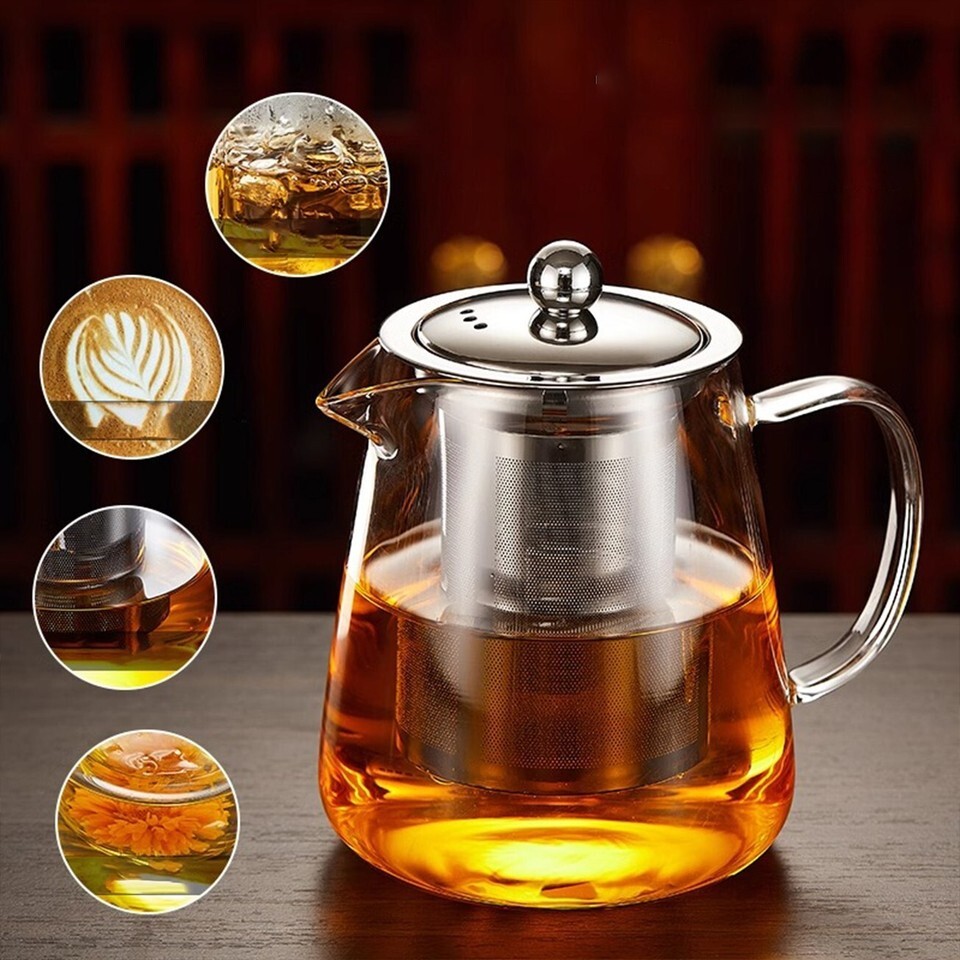 ?Removable Infuser?This glass teapot has a removable glass infuser. This infuser is made of 18/8 stainless steel and has an ultra-fine strainer that can filter most teas. You can use this glass tea pot to brew loose leaf tea, tea bags, blooming camellia, fruit tea, herbal tea.