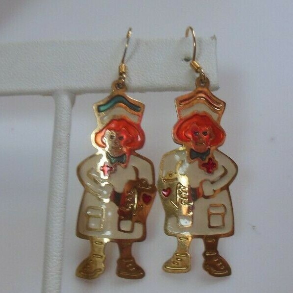 The blue enamel at top of nurse cap is missing on one of the earrings, otherwise very good condition
