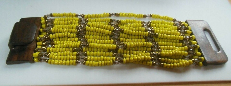 Vintage Lime Green/Yellow Glass Bead Crystal Wood Buckle Stretch Bracelet