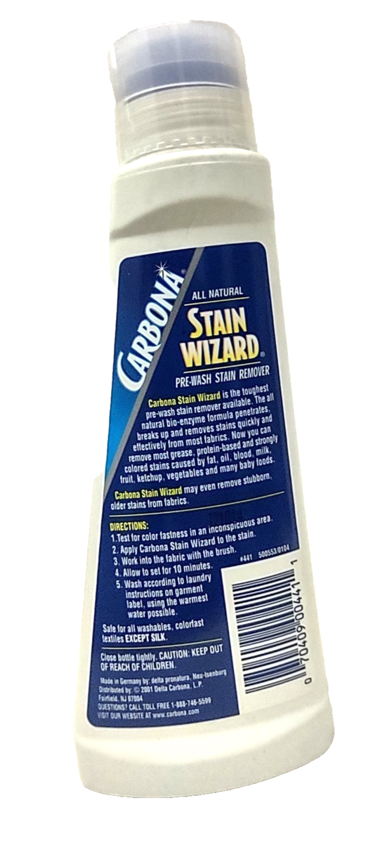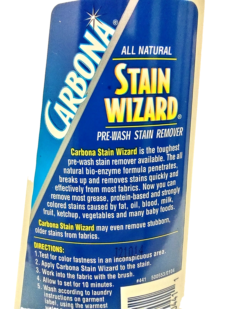 Pre-wash stain remover. Extra strength bio-enzyme formula gets out more stains! All natural. Carbona Stain Wizard is the toughest pre-wash stain remover available. The all natural bio-enzyme formula penetrates, breaks up and removes stains quickly and effectively from most fabrics. No you can remove most grease, protein-based and strongly colored stains caused by fat, oil, blood, milk, fruit, ketchup, vegetables and may baby foods. It may even remove stubborn, older stains from fabrics.