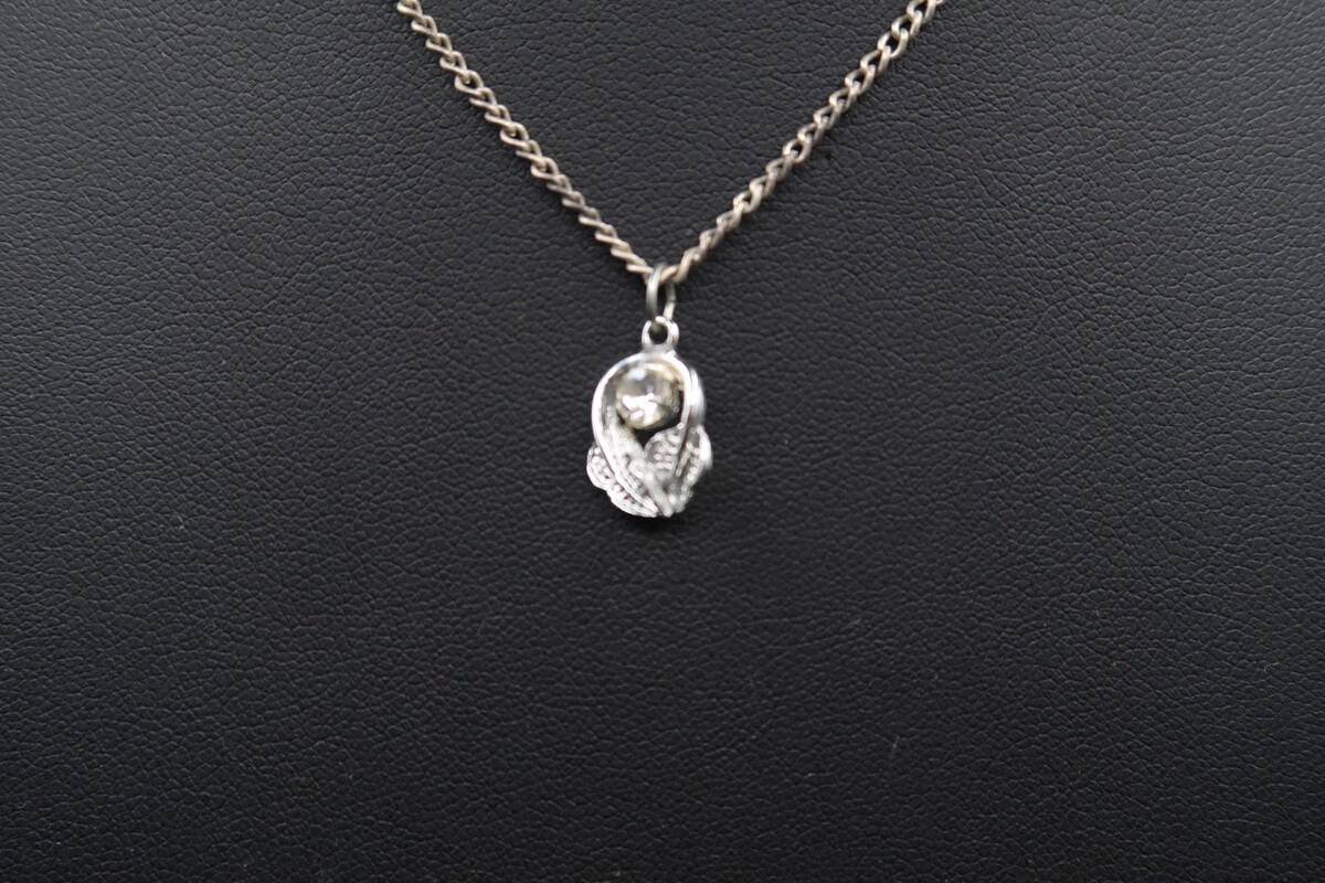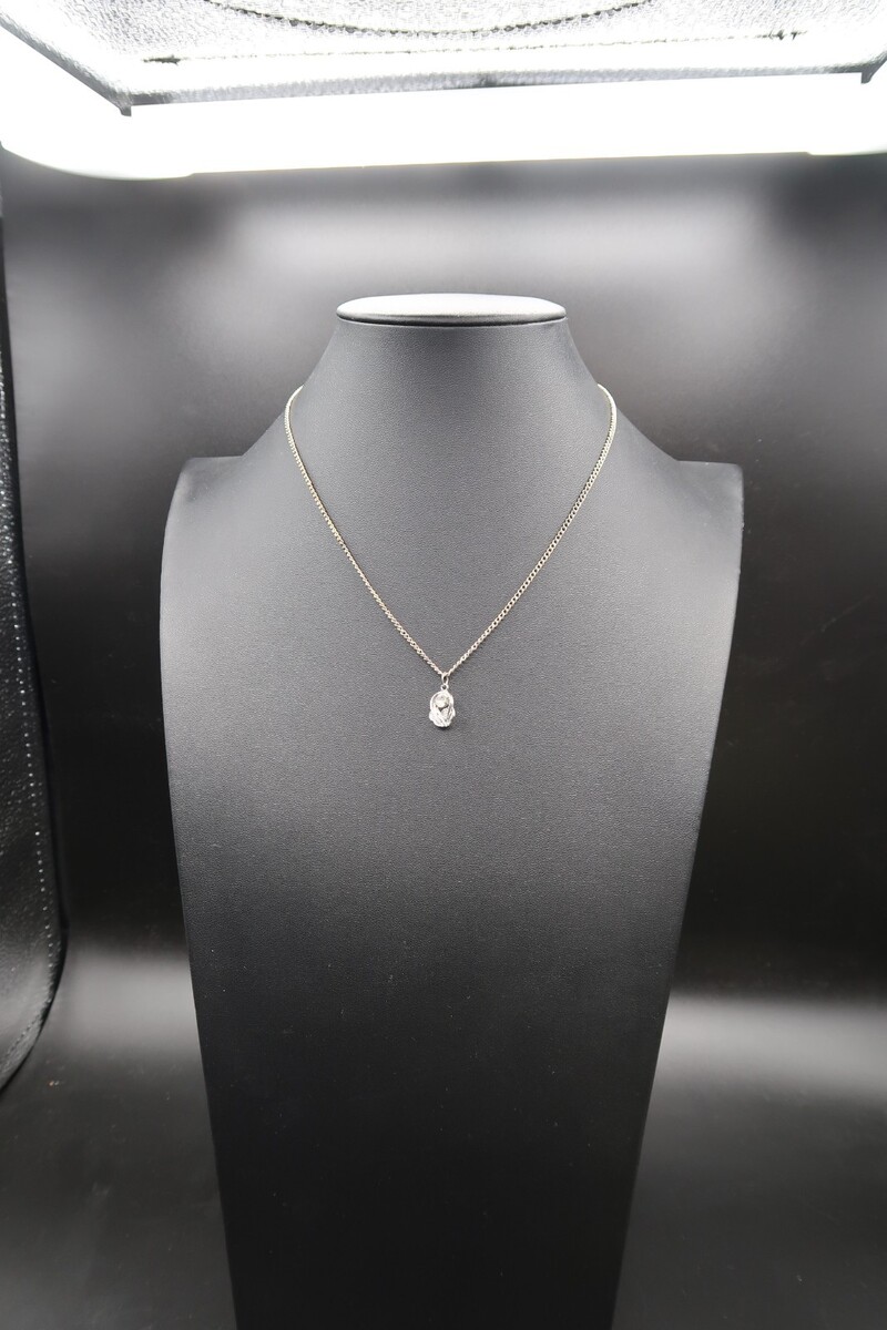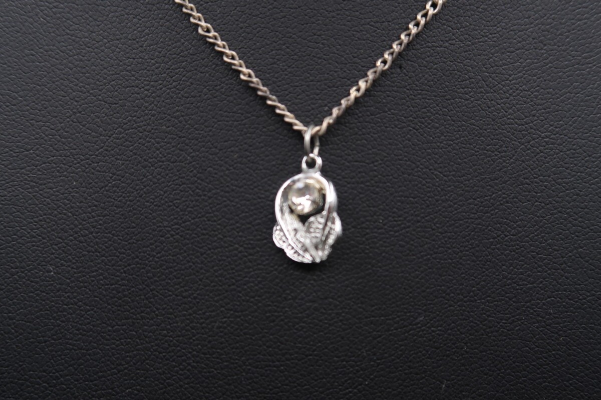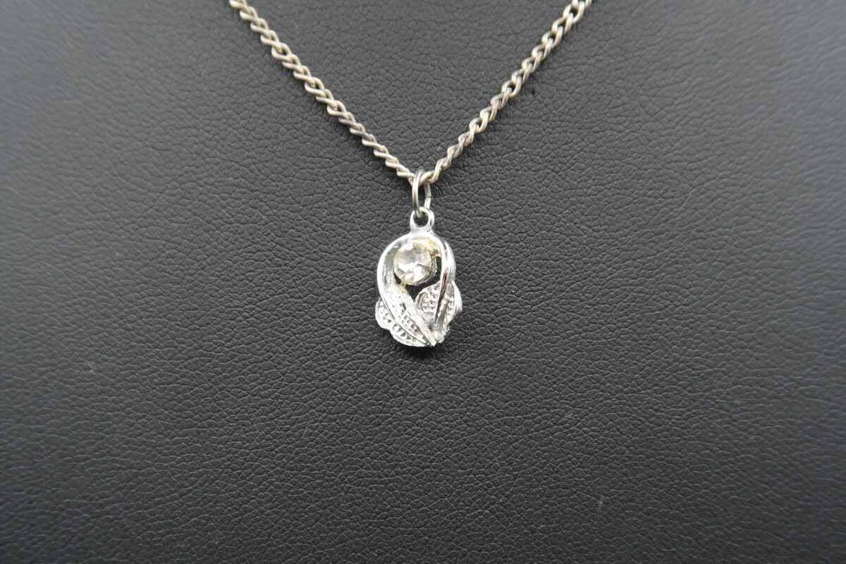 Vtg Necklace Silver Tone w/ White Rhinestone Leaf Pendent 16" Princess Length