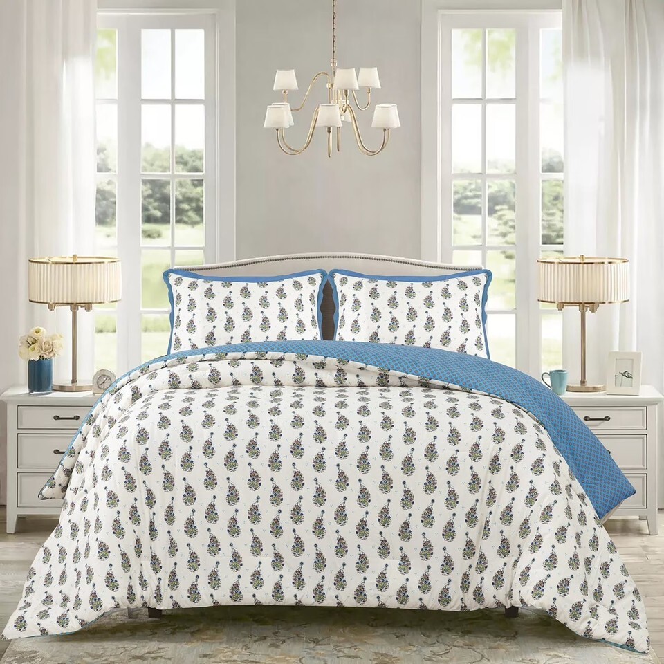 Includes 1 Comforter and 2 Shams and a printed fabric tote packaging