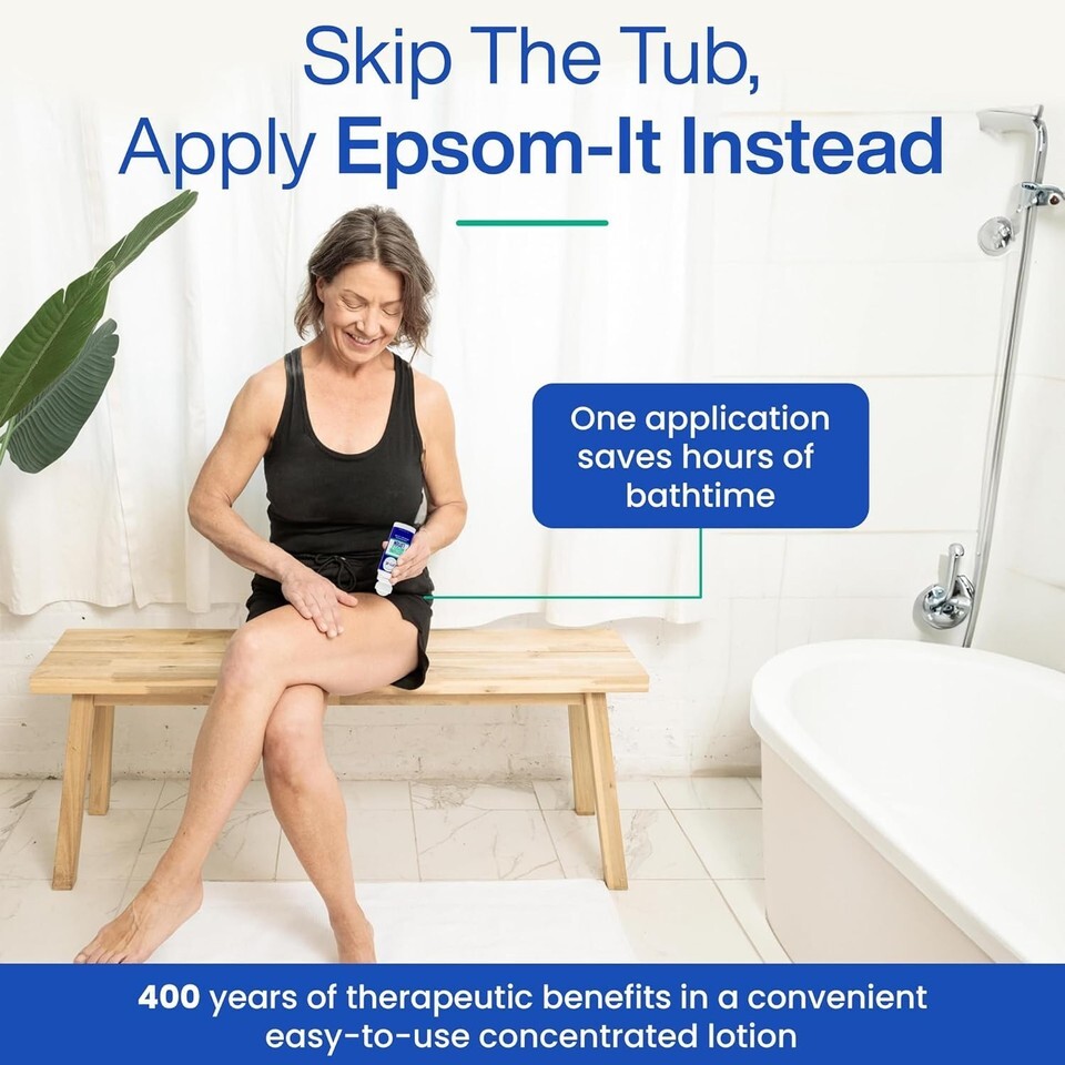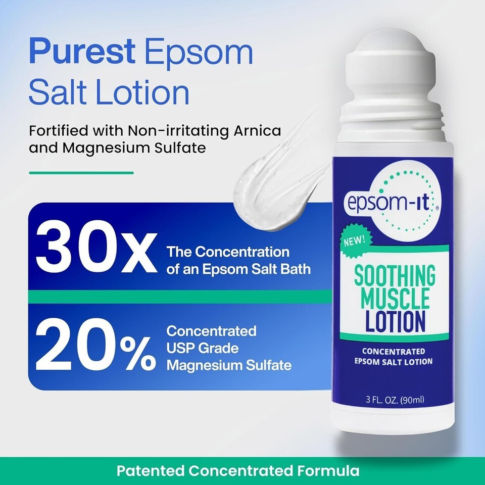Epsom Salts, Anytime, Anywhere - Skip the tub and enjoy the soothing benefits of Epsom salt in lotion form! Epsom-It magnesium lotion is 30x more potent than a traditional Epsom Salt bath soak with a 20% concentration of 100% pure USP Grade Magnesium Sulfate. Soothing Muscle Lotion and Rollerball - Fortified with Arnica, this topical Magnesium cream penetrates deep under the skin delivering targeted support to muscle stiffness and discomfort, and leg cramps from intense workouts, manual labor, aging, and more. Quick Absorbing Fast Acting - The greaseless and fragrance-free muscle rub is gentle on the skin and absorbs rapidly. Use the soothing muscle body lotion to relax your neck, back, knees, hips, feet,and tired legs. Easy Application - Designed for daily use, apply the Epsom Salt lotion generously to affected areas as needed and massage thoroughly for maximum results. Add to your daily skincare routine or use before bed. Reclaim Your Active Life - Epsom-It Magnesium cream empowers you to lead a healthier, more active life by alleviating joint and muscle discomfort that can hinder mobility. Manufactured in the USA to the highest quality and standards.