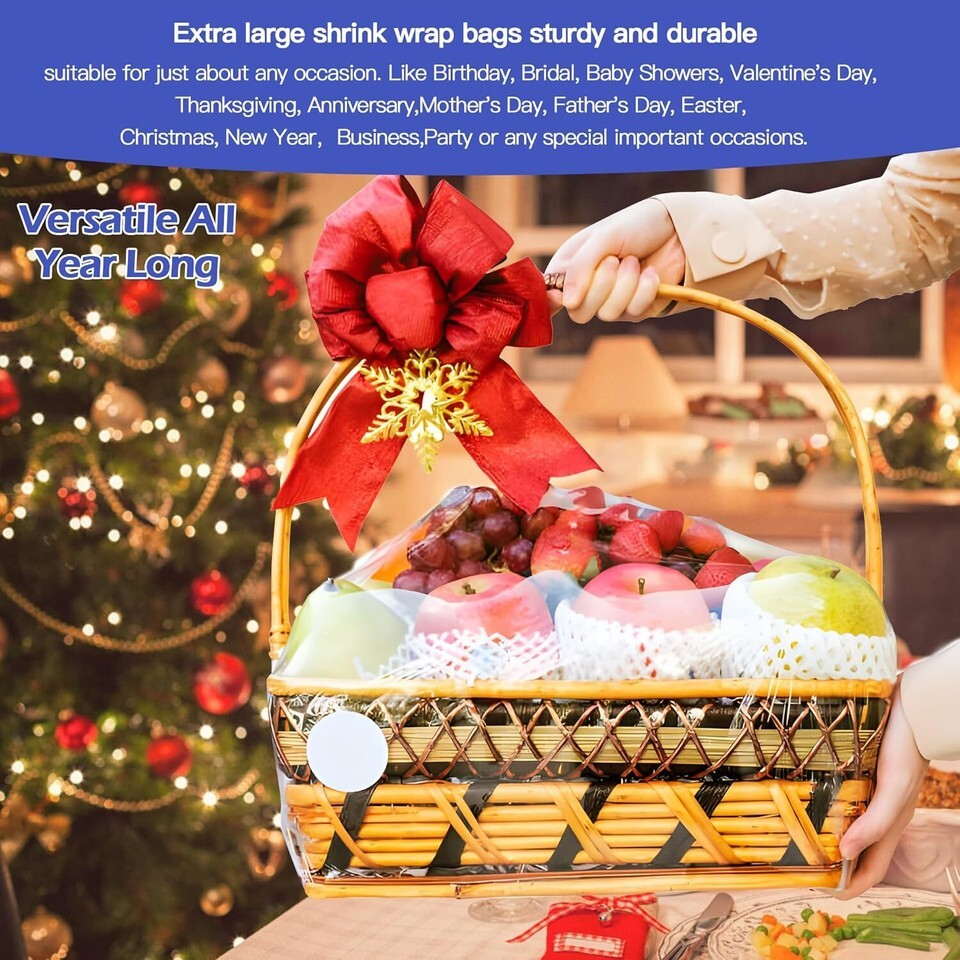 Large cellophane shrink wrap bags are great for wrapping Easter baskets,Christmas baskets,silent auction baskets,raffle baskets, baby shower basket and other large gift baskets etc. Shrink basket bag also suitable for wrapping gifts, pictures,books, photo frames, wine bottle,fruits,vegetable and snacks will make a good impression on the receiver, or use them to store some daily necessities like a garment, storage shoes bedding and etc.Also great for keeping moisture and dirt out,keeping your food and treats fresh and clean.