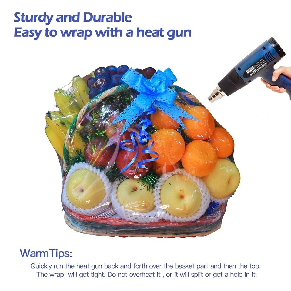 With the ability to shrink up 50% to any form ,the shrink effect of shrink bags are easily achieved.Heat shrink wrap bags shrink up quickly with a heat gun,clear basket bags save you wrapping time and offer a tailored fit for your gift baskets.They will not only work beautifully and shrink perfectly around the baskets but keep everything more secure in the baskets.